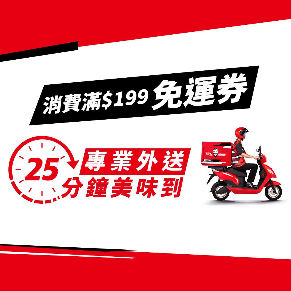 外送消費滿$199免運券:肯德基專業外送的愛用者有福了,外送消費滿$199,免運費送到家,專業外送服務,在家也能輕鬆享用美味與25分鐘專業外送美味到服務,省下運費,讓用餐體驗更划算。