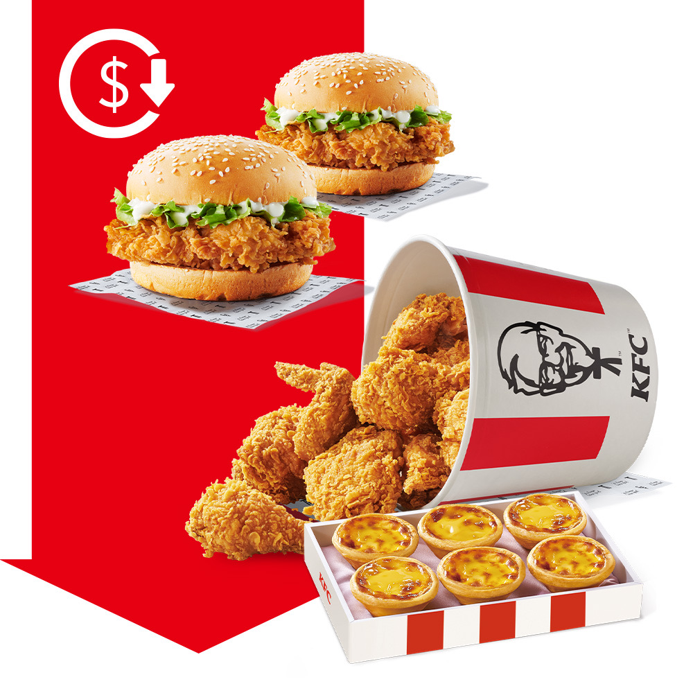 肯德基「狂省八塊雞桶餐」59折(優惠代碼:50465)炸雞蛋撻只要$499;經典酥脆多汁的咔啦雞腿堡第二件5折(優惠代碼:40650)!