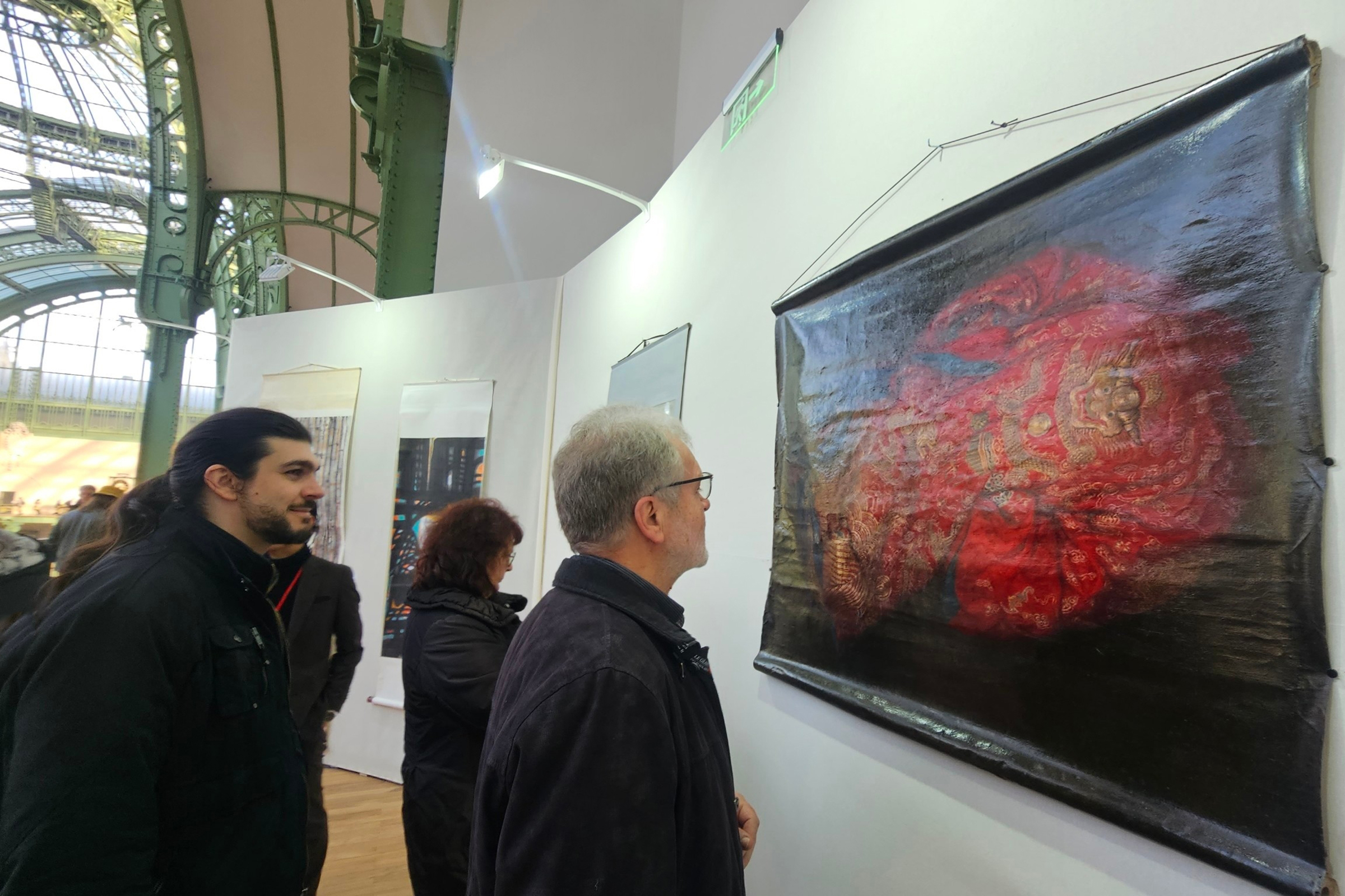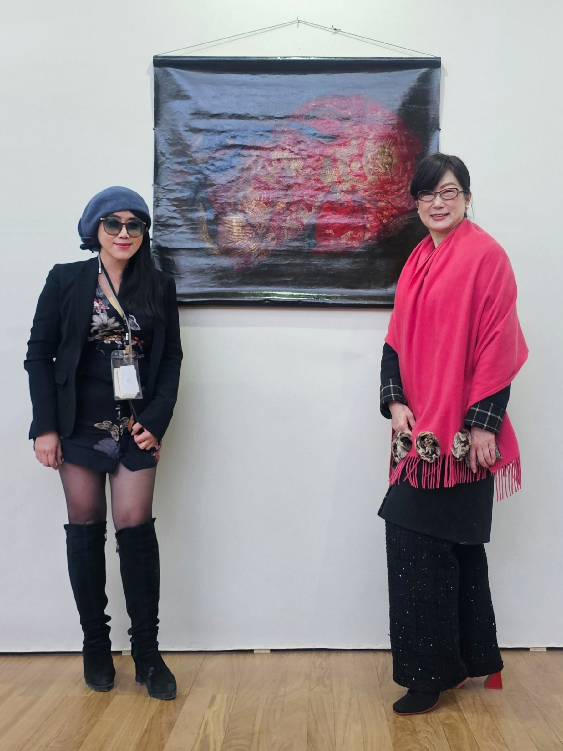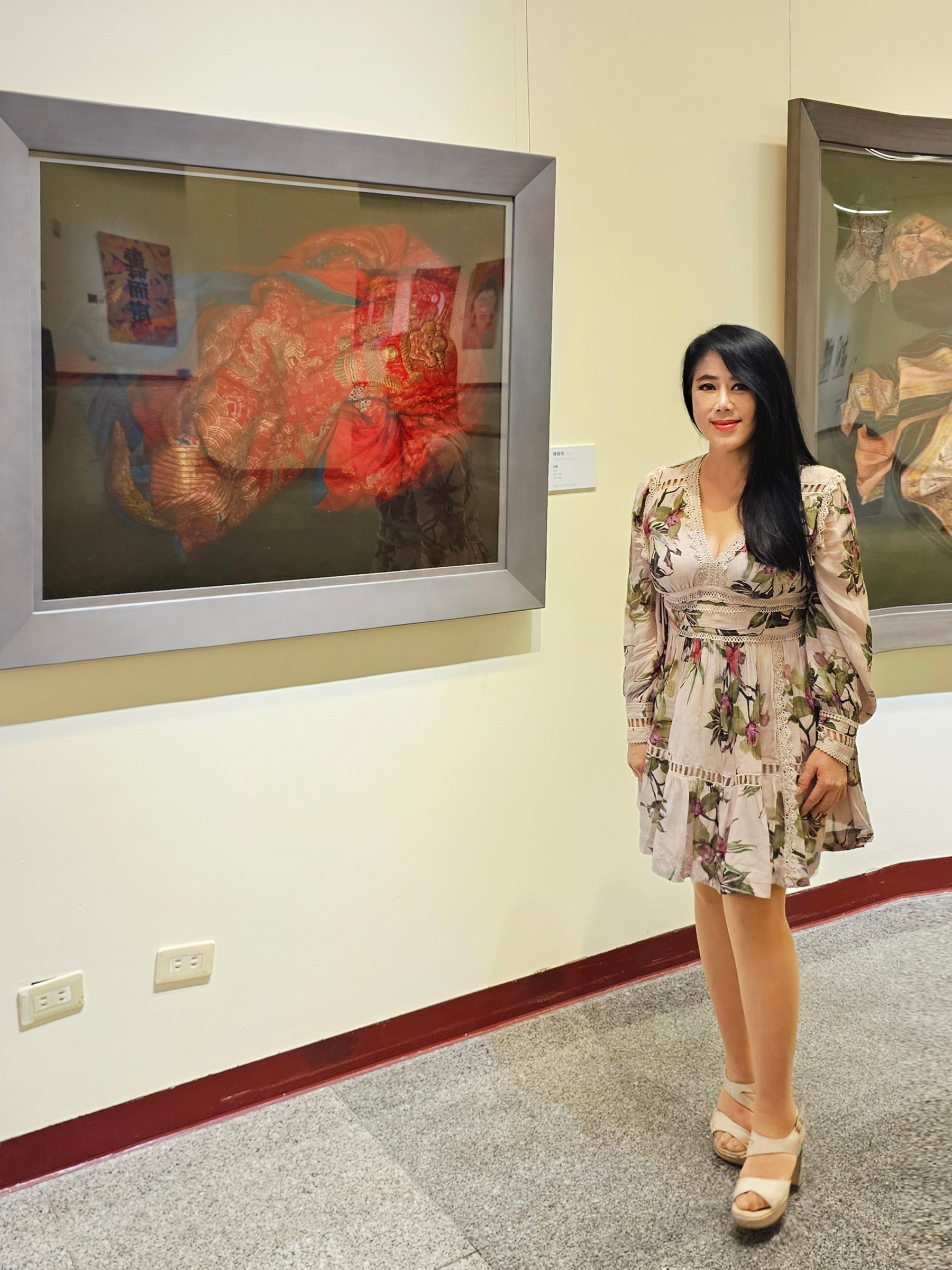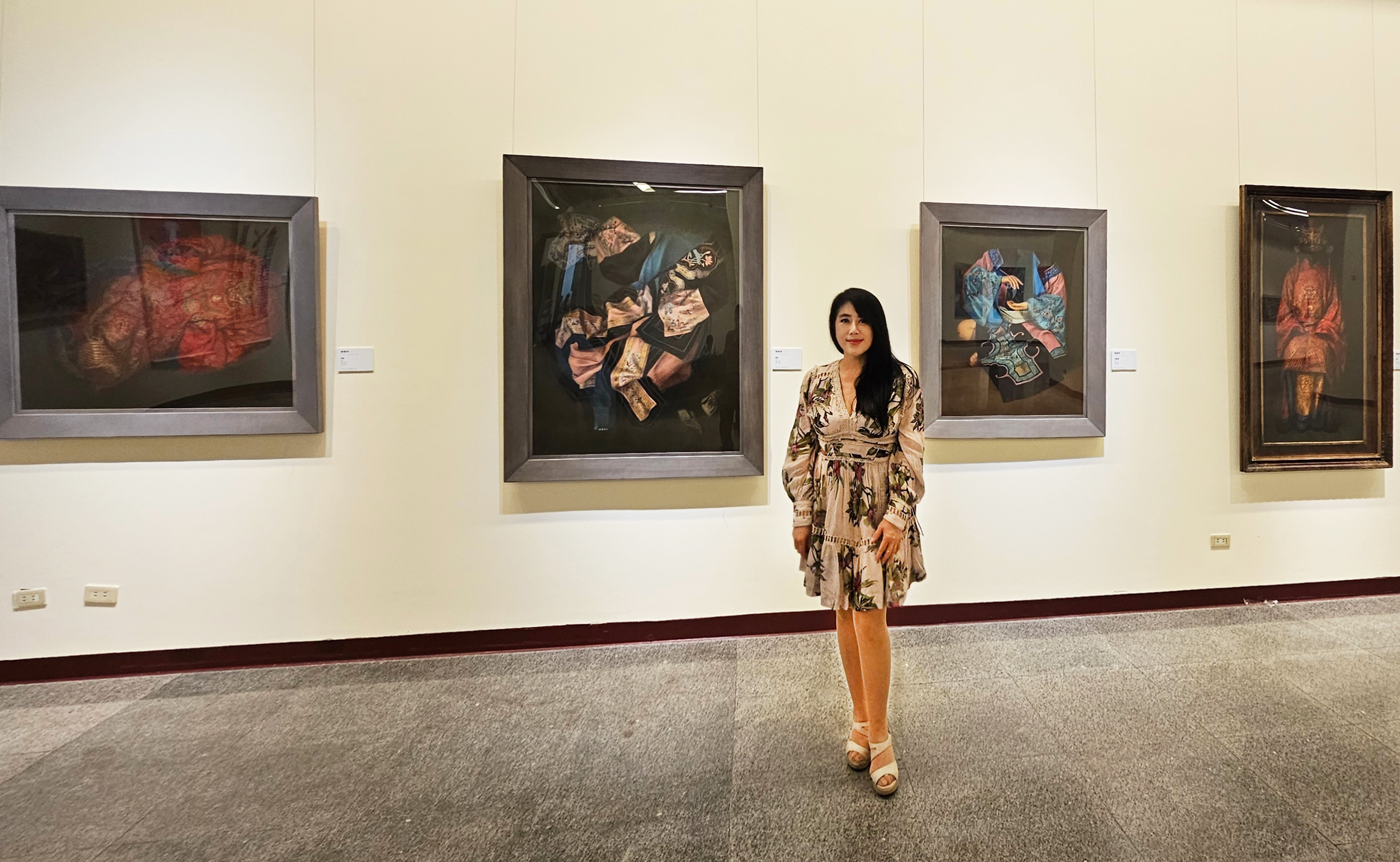 文化部長李遠亦到場致詞時表示:「能夠參與如此重要的藝展盛會備感榮耀」。其多年來除了在台南應用科技大學美術系任教作育英才,培養許多藝術專才在國內外散播藝術的種子,更致力於油畫創作並以寫實細緻的畫風聞名。她擅長以清朝刺繡物件來詮釋女性議題,此次遠赴法國巴黎大皇宮展出的油畫創作「烈愛」亦在中正紀念堂展出,此件畫作中的清朝紅色蟒袍是婚嫁的象徵,其以此物件做為創作的主要元素,是在反思婚姻對現代女性的意義。豔紅的嫁衣代表熾熱的愛戀,布面上的金色吉祥紋樣則隱涵對婚姻的期許,藉此探討以愛為名的婚姻對女性而言是自我價值的實現,還是無我的全然奉獻。