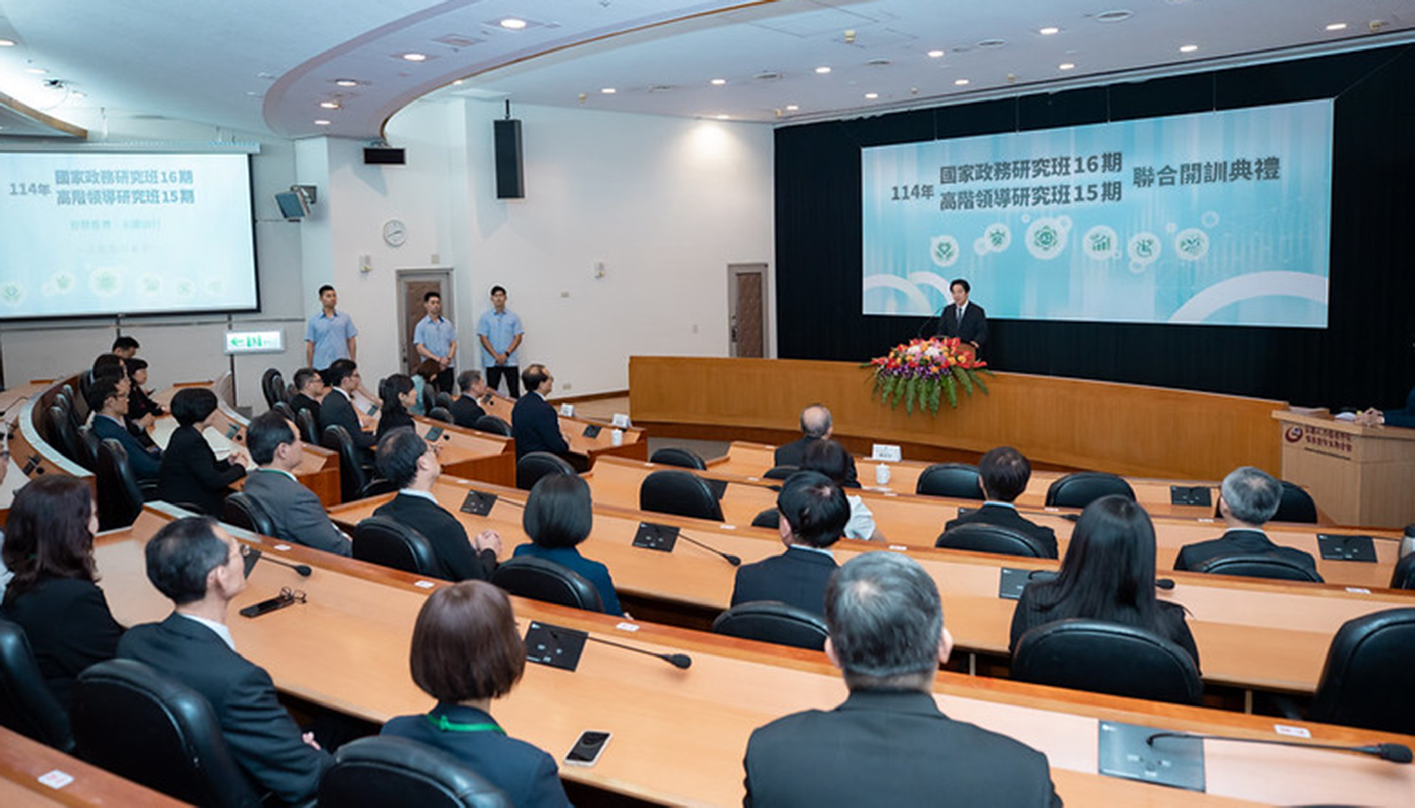 總統致詞時表示,看到來自中央與地方的各部門菁英齊聚一堂,準備接受為期9週,包含國內、國外的訓練與研習交流,他為大家感到高興。也期許大家結訓後,能力更強、視野更廣,未來承擔更大的責任,為臺灣做出更多貢獻,當前世界面臨許多挑戰,無論是威權主義擴張的威脅,還是AI科技日新月異、淨零轉型、人口高齡化的衝擊,都需要政府與民間協力合作,以宏觀思維、跨域治理及全球性的領導視野,才能將世界的挑戰轉化為臺灣未來發展的機會。