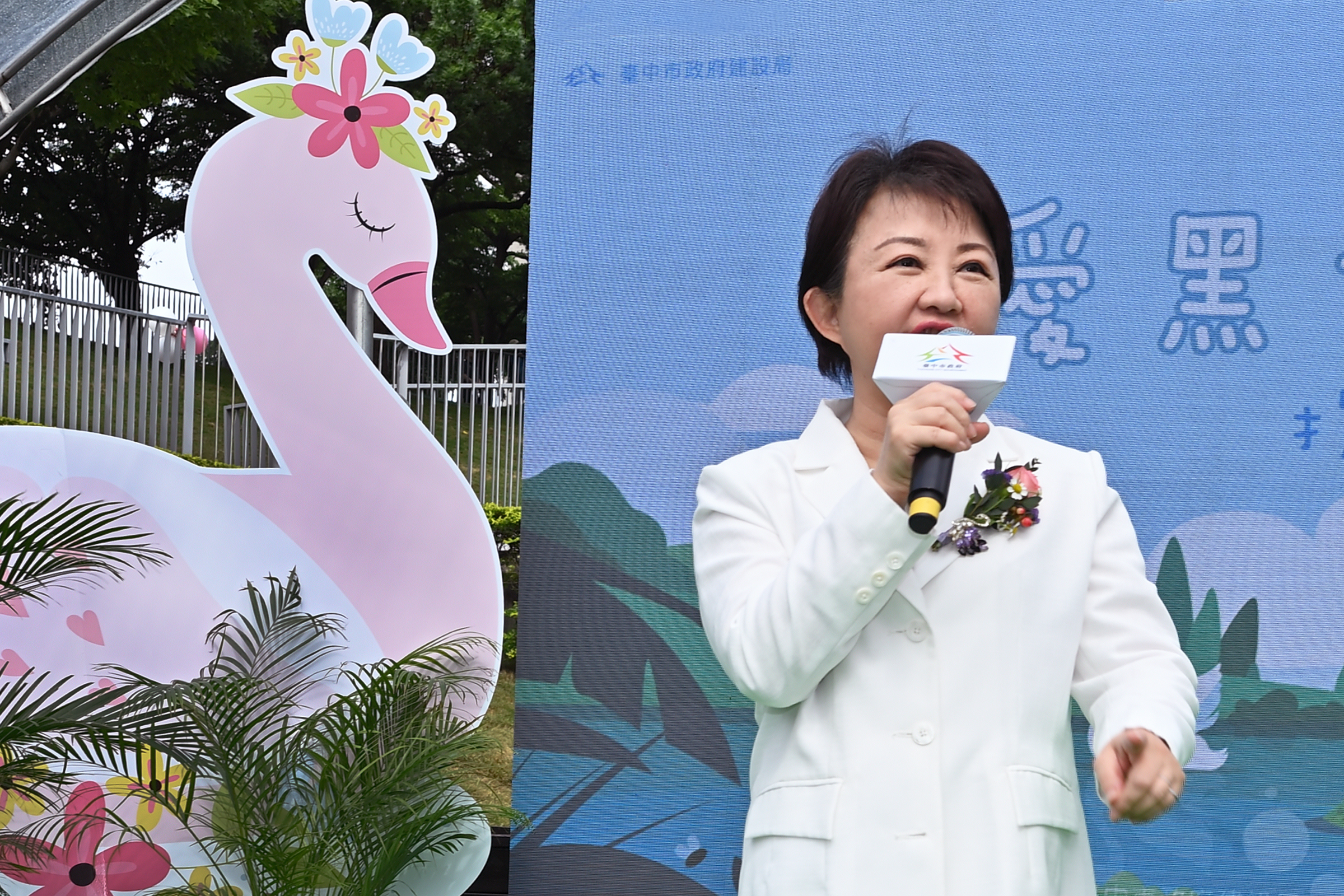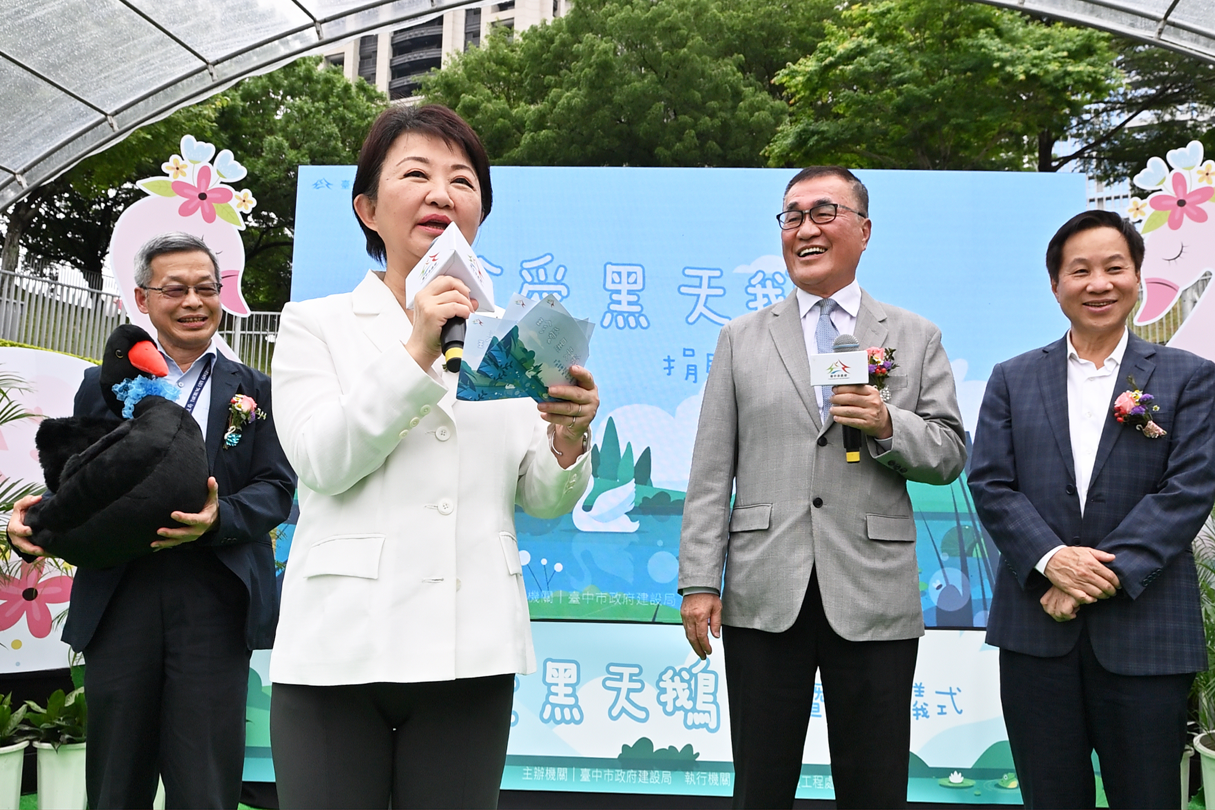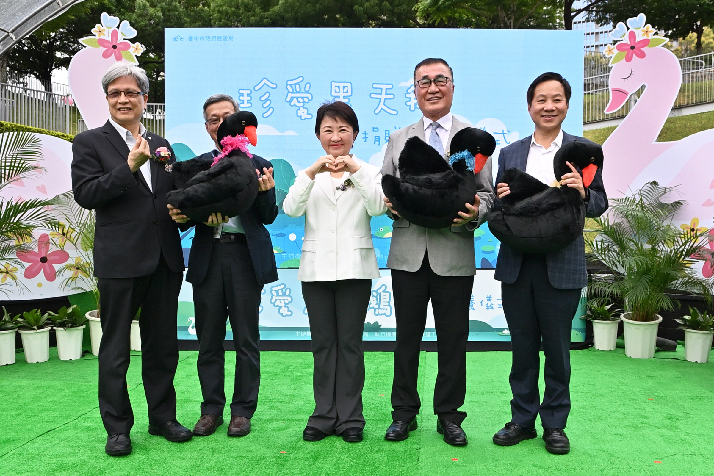 台中市長盧秀燕表示,台中市近年人丁與動物皆興旺,自兩年前首批黑天鵝入住秋紅谷以來,園區陸續成功孵化出多隻鵝寶寶,如今黑天鵝家族已壯大至15隻。為讓這些「鵝」子、女「鵝」有更好的成長環境,中市府今日與台北市政府、台北大學、東海大學正式「結為親家」,三方皆在動物保育與生態教育上表現優異,市府對此次合作深感放心,也相信未來彼此會因「鵝」子、女「鵝」建立更密切的互動。她也盼他們在新家健康成長,繼續孕育更多生命,並推動生態保育向下扎根。