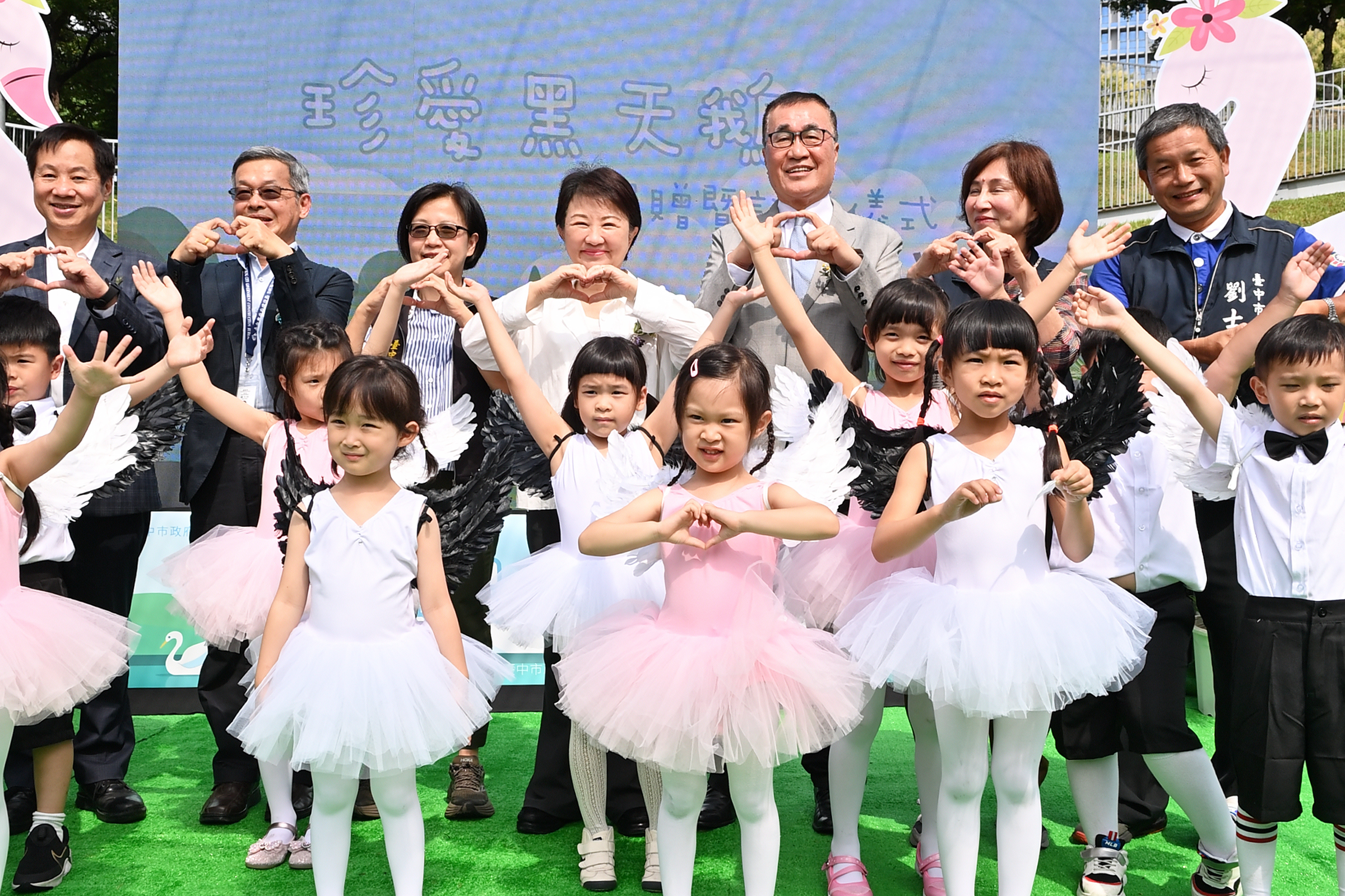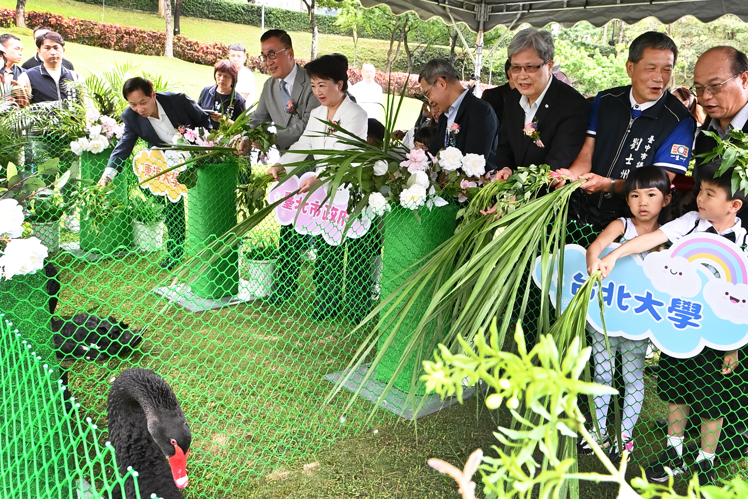 兩年前進駐秋紅谷的兩對黑天鵝,在市府的細心照料下順利繁衍,如今家族成員已擴增至15隻。市長盧秀燕今(28)日親自主持「黑天鵝贈養儀式」,將6隻黑天鵝分贈成功媒合的單位,包括台北市政府、台北大學與東海大學均各獲一對,包括台北市副市長李四川、台北大學校長李承嘉及東海大學校長張國恩皆出席迎接,盼透過此次贈養,共同打造更多友善棲息環境,推動生態教育,讓更多民眾有機會親近黑天鵝、認識自然生態之美。