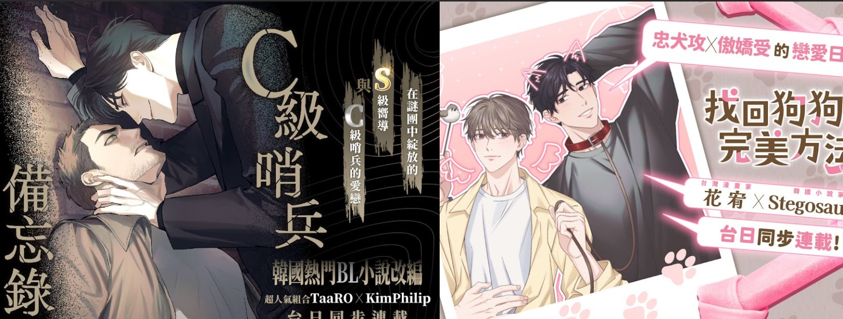 臺灣漫畫搶佔日本線上平臺!文化內容策進院(文策院)與韓國條漫製作公司 Contents Lab. Blue TOKYO(CLB) 合作,由兩位臺灣漫畫家花宥、TaaRO 改編韓國人氣 BL 小說原著所創作的條漫《找回狗狗的完美方法》和《C級哨兵備忘錄》,自 4 月 28 日起已在文策院《CCC追漫台》以及包含 コミックシーモア、BookLive、Piccoma 等十個日本線上閱覽平臺上架連載,將粉絲們心中糖度爆表的小說情節以細緻的漫畫呈現。