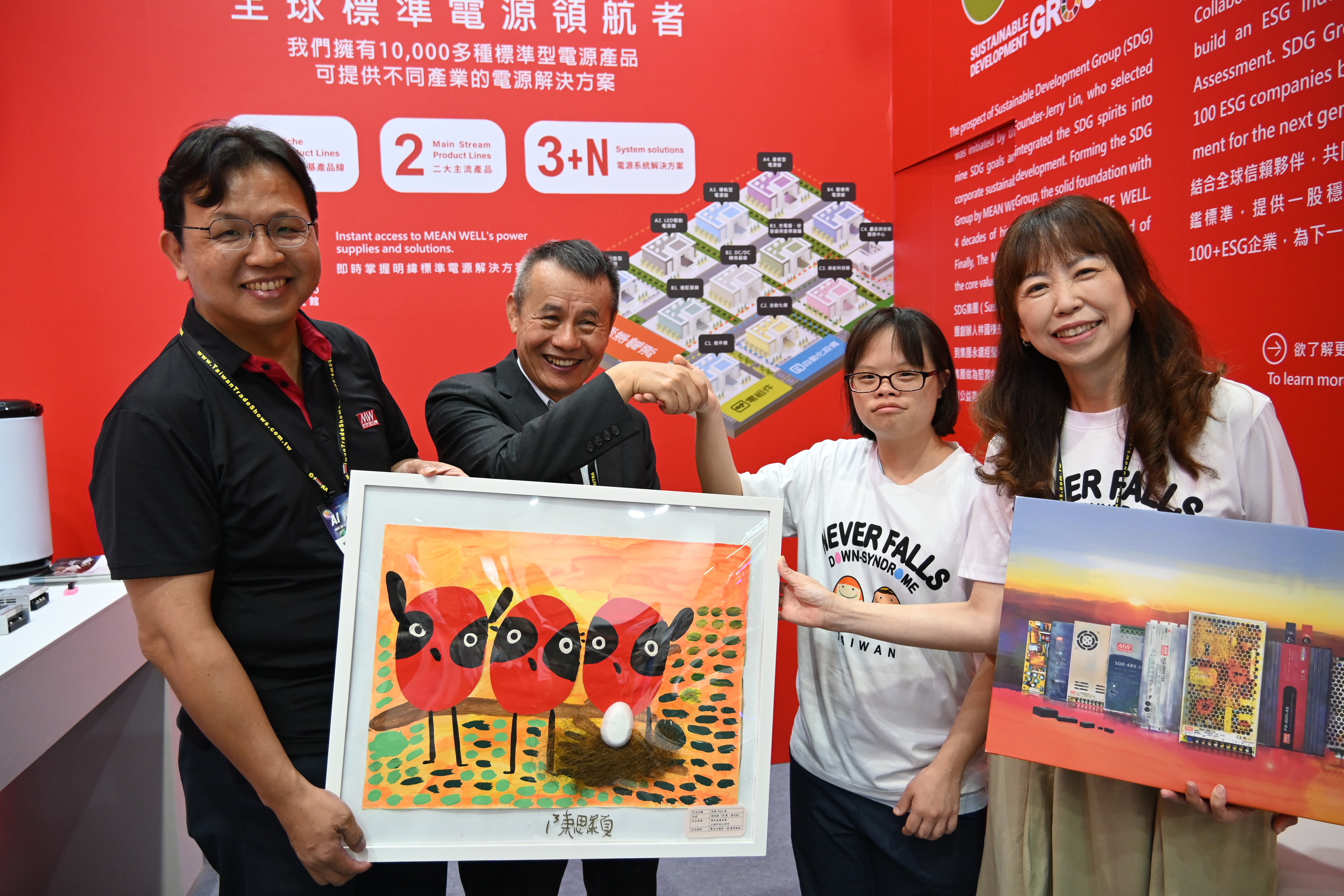 明緯企業建置SDG SHARE+ APP共享平台,透過「SDG點數」串聯夥伴關係與公益行動,實踐「每一點點數,都是一份愛」的理念。為見證此次公益品牌聯盟,於COMPUTEX電腦展的明緯攤位上,也特別舉行一場溫馨的儀式,唐氏症基金會執行長林美智致贈一幅由土城小作所唐寶寶親手創作的畫作,象徵善的循環與愛的延續;明緯創辦人林國棟則回贈一幅「全球標準電源標竿」主題油畫,象徵企業與時俱進與永續傳承,締結雙方公益合作的情感與願景。