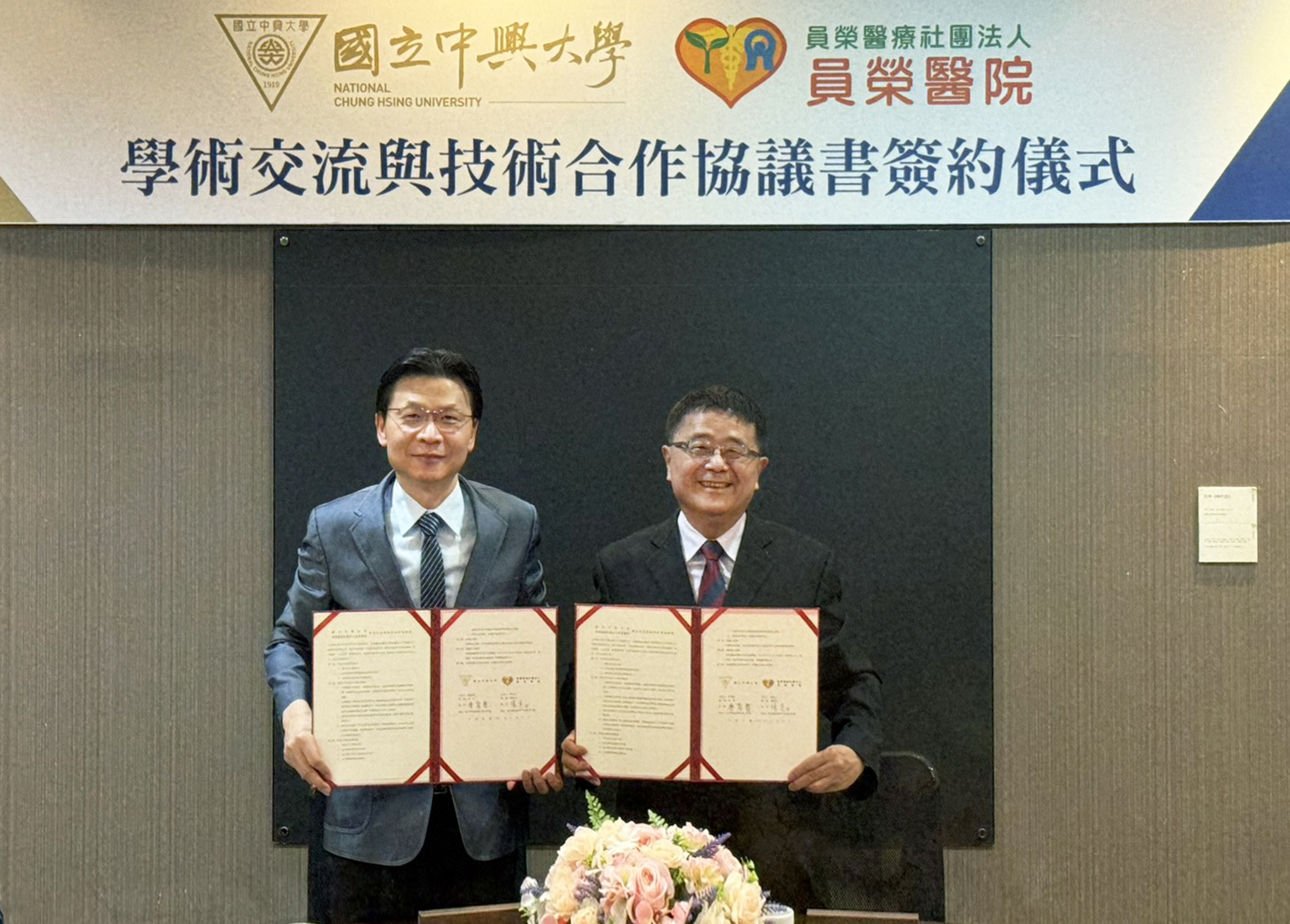 中興大學與員榮醫療體系於今天簽署《學術交流與技術合作協議書》,由員榮醫療體系張克士總院長與興大詹富智校長代表簽約,雙方將就醫學研究、產學合作、培育醫護人才與發展智慧醫療等多面向深化合作。興大有醫學院與學士後醫學系,員榮新的總醫院正在興建中,預計三年後落成,需要大批醫護人員,未來將與興大相關科系深化產學合作。