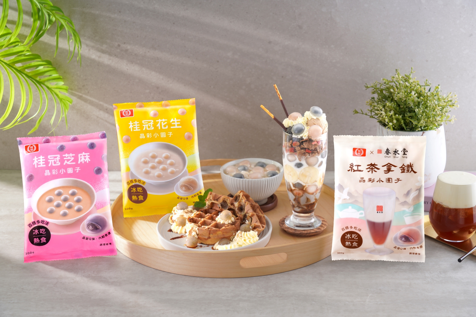 桂冠表示,晶彩小圓子首波推出三款風味,包含攜手「春水堂」共同研發的聯名新品「紅茶拿鐵晶彩小圓子」;同步上市的還有兩款桂冠經典風味:「芝麻晶彩小圓子」與「花生晶彩小圓子」,適合搭配飲品、甜湯或作為獨立甜點,展現出多元創意與使用彈性,開啟餐桌靈感的新提案。