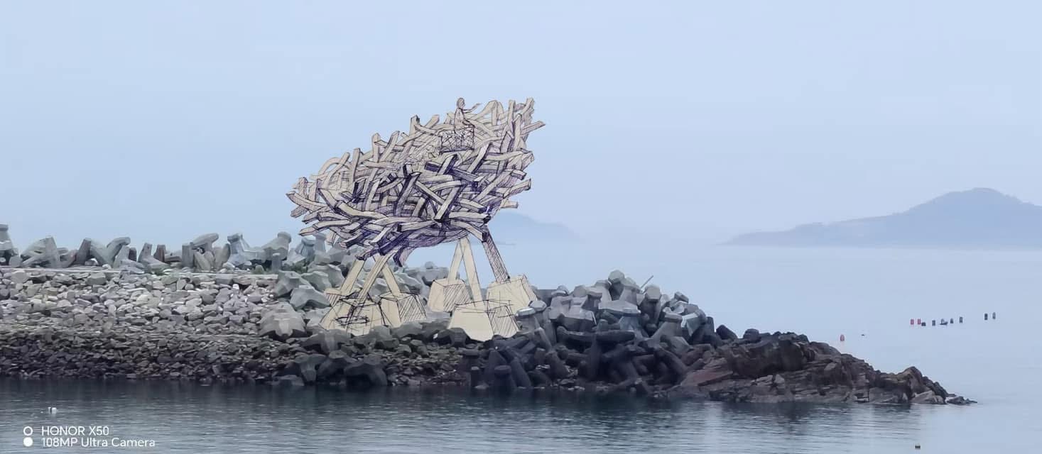 南竿珠螺海灣長堤,有馬祖雕塑家陳益輝的大型海岸地景作品《築巢》_作品草圖。(圖:林文強/翻攝)