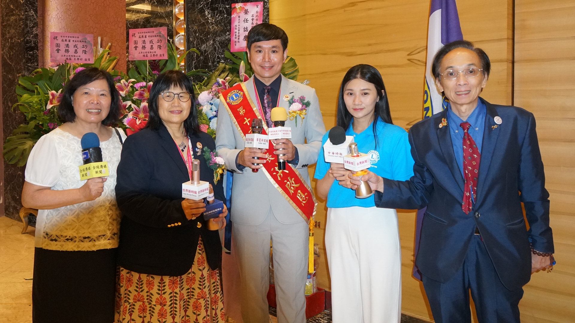 圖中為金剛獅子會洪啟恩會長與石英雀會長、前會長黃秋梅獅友,也是現任GLT協調長、前行銷長、前宏獅雜誌社長(右五)與黃桎橋第一副會長(右二),接受中華時報、華夏電報暨台灣新聞、北市新聞網、世界新時報.廣播電台等媒體記者聯訪,自媒體電子報劉社長(右一)採訪合影