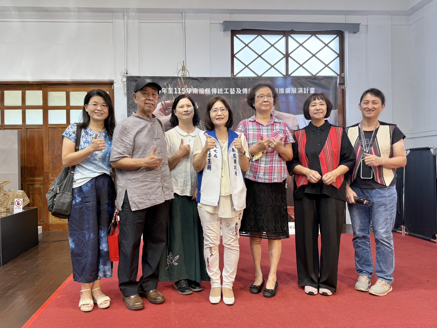 圖一當傳統竹藝遇上AI導覽~南投縣傳統工藝大展五大竹編藝師聯展李玉蘭代理局長(左5)邀議員來賓共同啟動儀式。 (劉興澤大師提供)