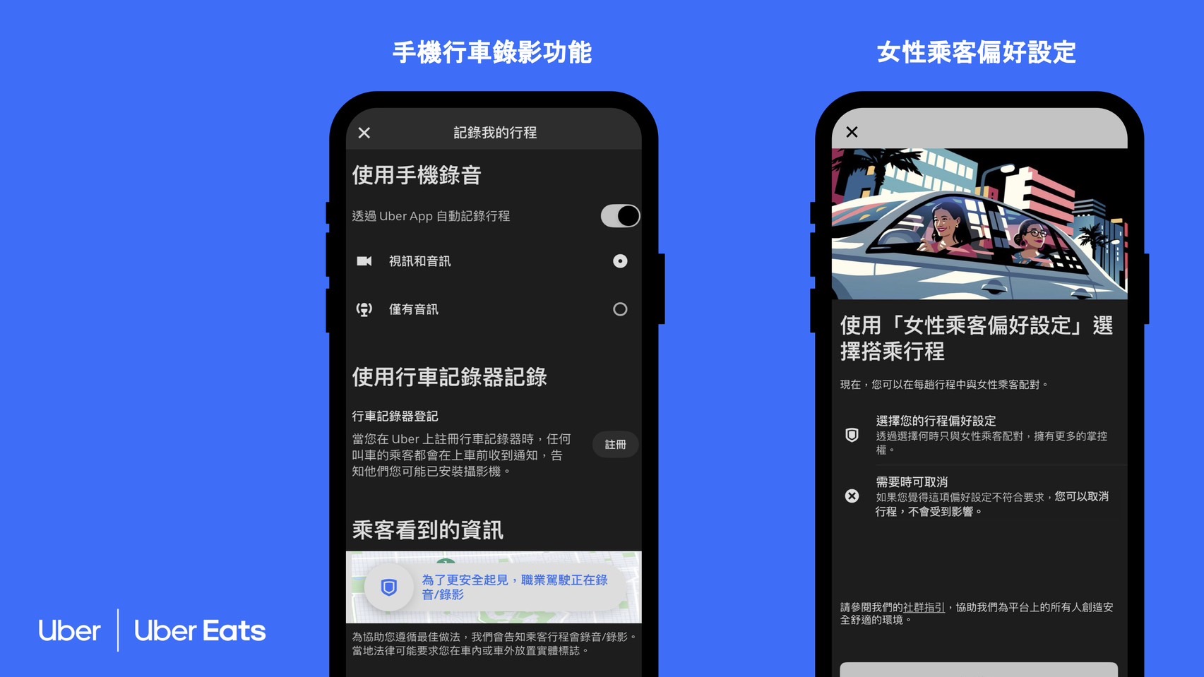Uber 與 Uber Eats 的安全科技,今年也將升級與推出新功能。針對合作車隊職業駕駛,2025 年底將推出兩大新功能:「女性乘客偏好設定」可讓女性職業駕駛配對女性乘客,提升安全感;而「手機行車錄影功能」則讓職業駕駛能在行程有安全疑慮時,啟用前鏡頭錄影,在職業駕駛提交安全事故報告並同意分享時,安全團隊才能解密檢視。