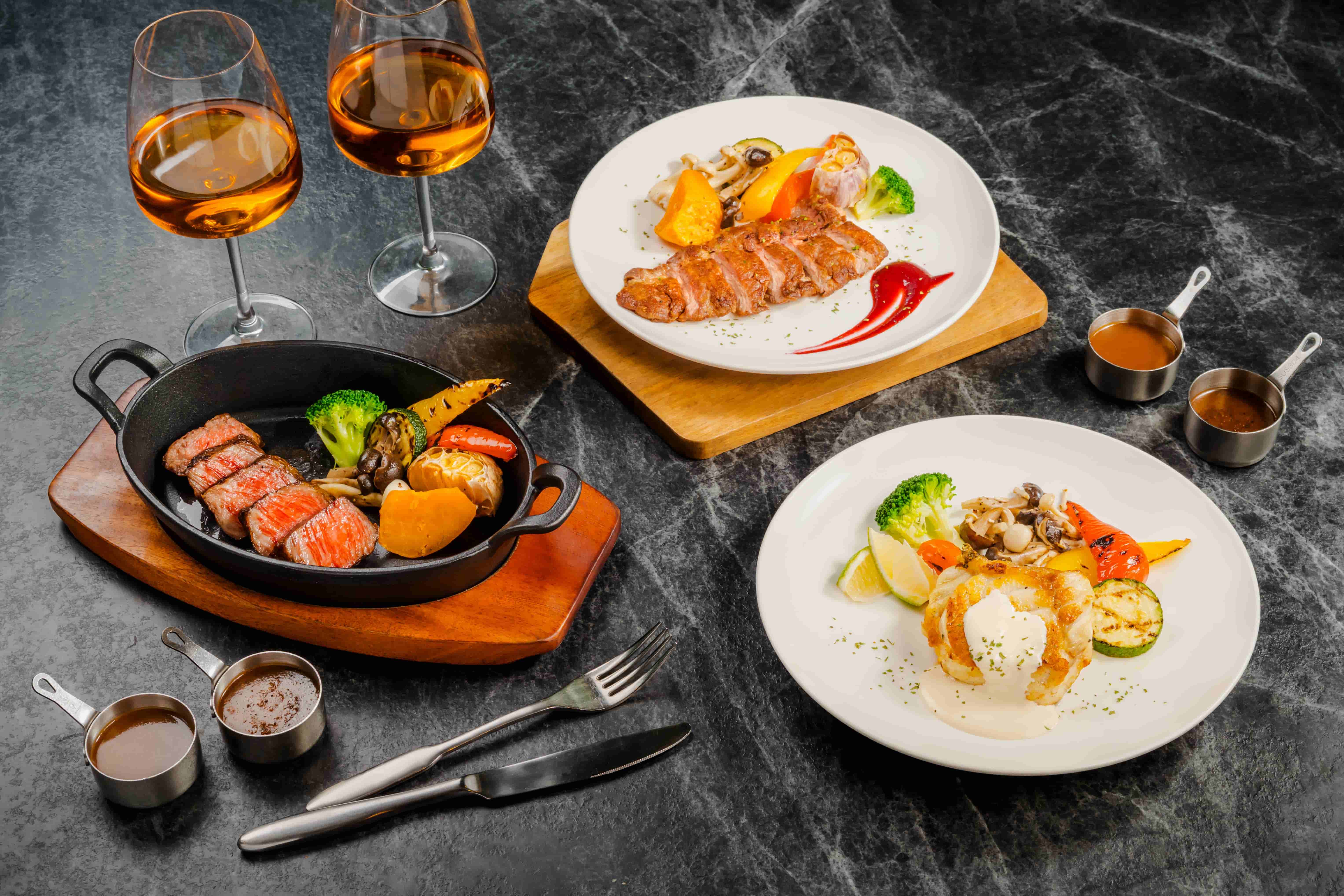 青焰也設計了獨家主選套餐與創意料理的海陸饗宴,包括美國極黑和牛,定價1,298元,油花細緻均勻,肉質細膩多汁,入口即化的極致口感,肉汁在舌尖輕輕釋放,層次豐盈持久回味;極品龍膽石斑佐白酒奶油醬,定價898元,深海孕育出的珍稀美味,肉質緊緻彈牙,油脂細膩,口感鮮甜高雅;伊比利老饕豬佐莓果醬,定價898元,擁有肥瘦相間的大理石紋,肉質緊實彈牙,脂香迷人。再搭配近百道的半自助吧,餐食特色更涵蓋美式、義式、泰式、日式與台式多元風格,同時有光焙若提供的蔬食料理,在台北市中心稱得上是吸睛度爆表。