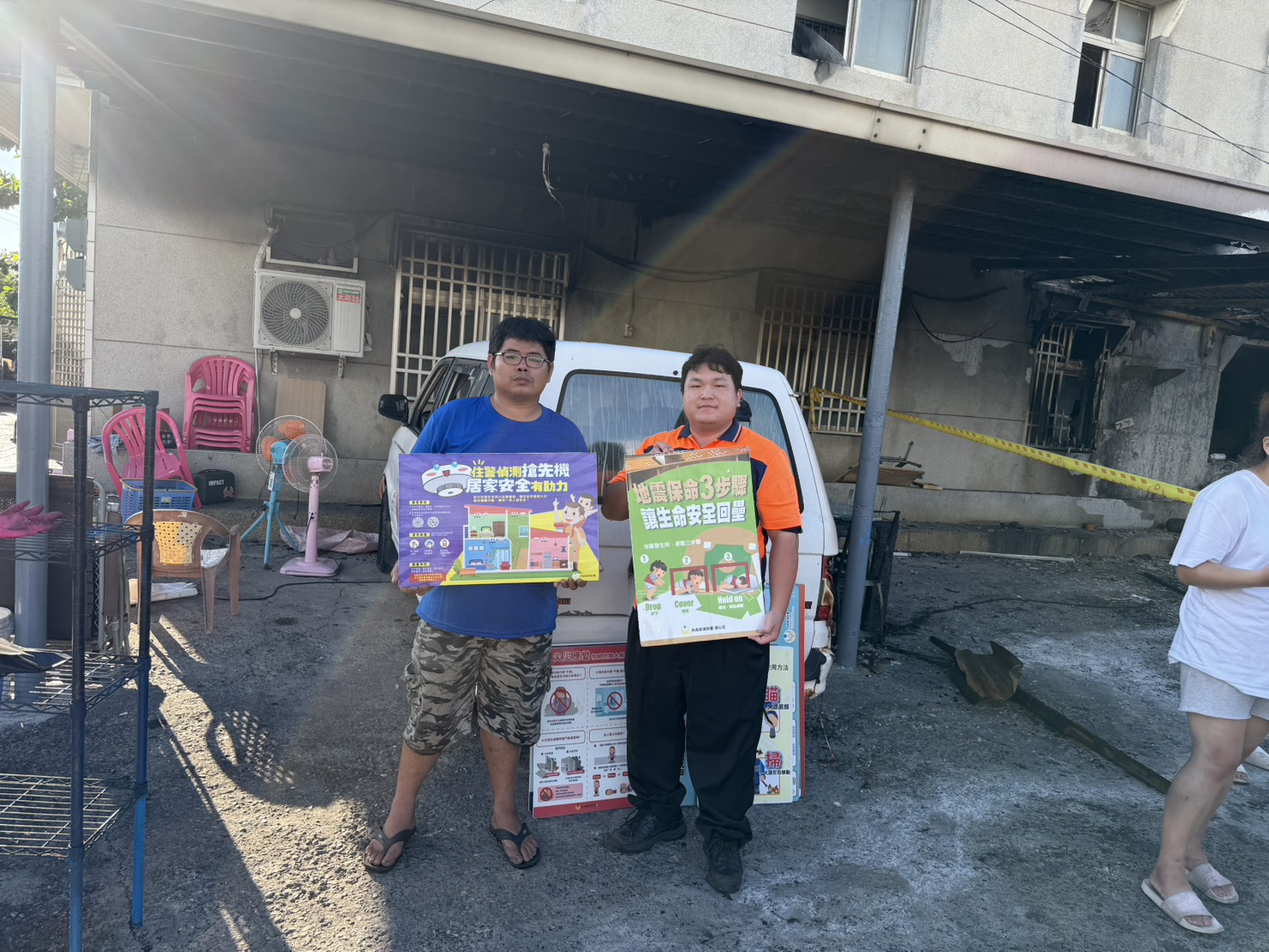 近日晚間轄內發生住宅火災,當時屋主家人正在透天厝家中休息,屋主媽媽突然發現屋外發生火災冒出熊熊大火及濃煙,立即通知家人避難逃生及通報119前往救災,所幸發現的早,人員都能逃生成功。台西分隊也於近期至附近進行災後訪視,提醒居民注意用火用電安全,家中要安裝住警器,火災發生才能提早避難逃生。