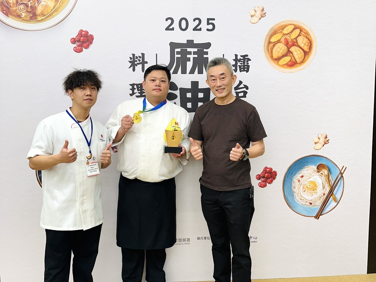 圖說:台北凱達大飯店行政主廚戴于益(右)指導研製,家宴中餐廳主廚簡偉倫(中)代表參賽,以經典佳餚「老火甘蔗頭麻油雞」勇奪「2025麻油料理擂台競賽」傳統組冠軍。