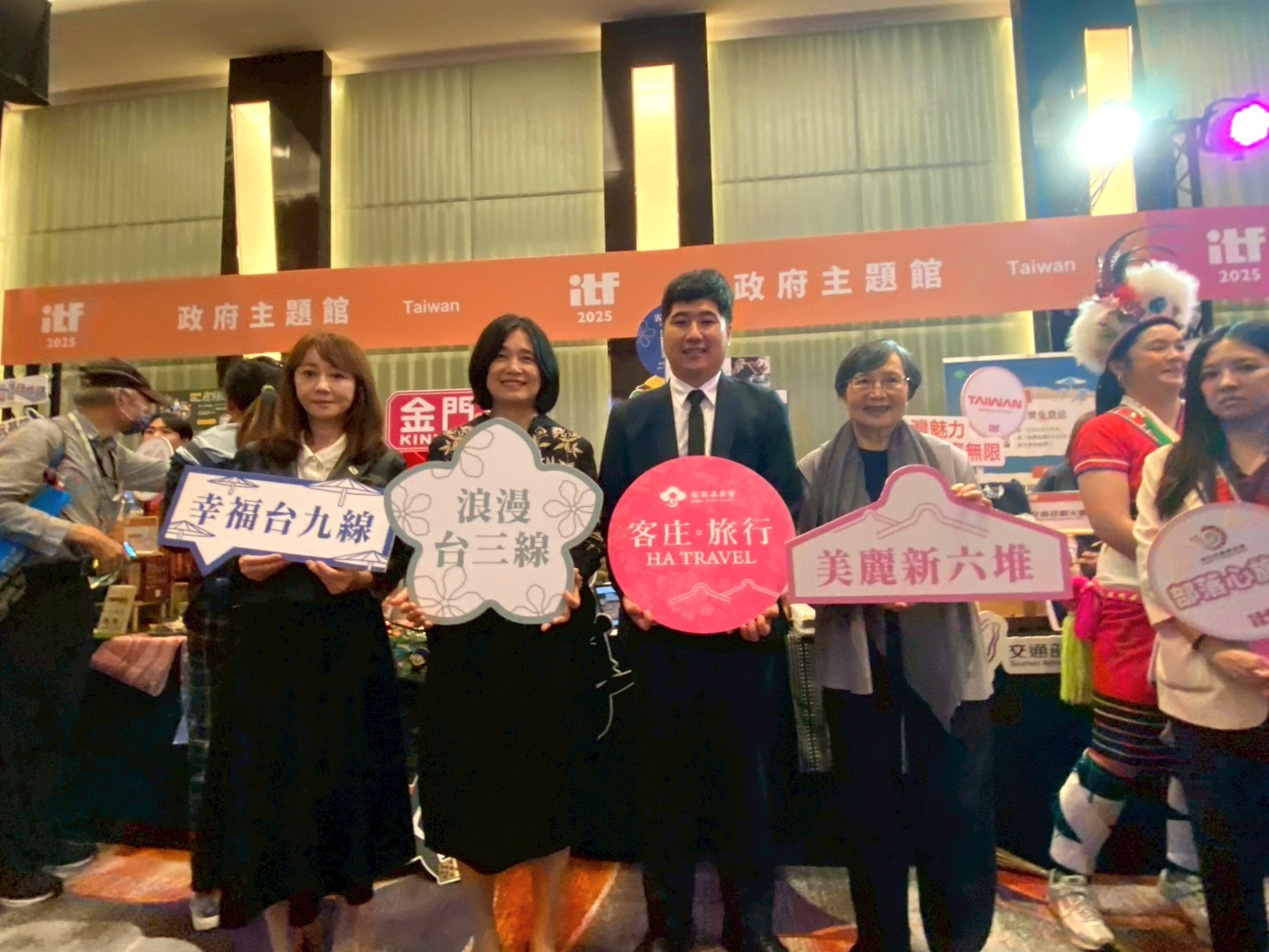 圖說:觀光協會簡余晏會長(左起)、觀光署陳玉秀署長、客委會邱星崴副主委、台北國際旅展籌備委員會葉菊蘭主委。(客家委員會提供)