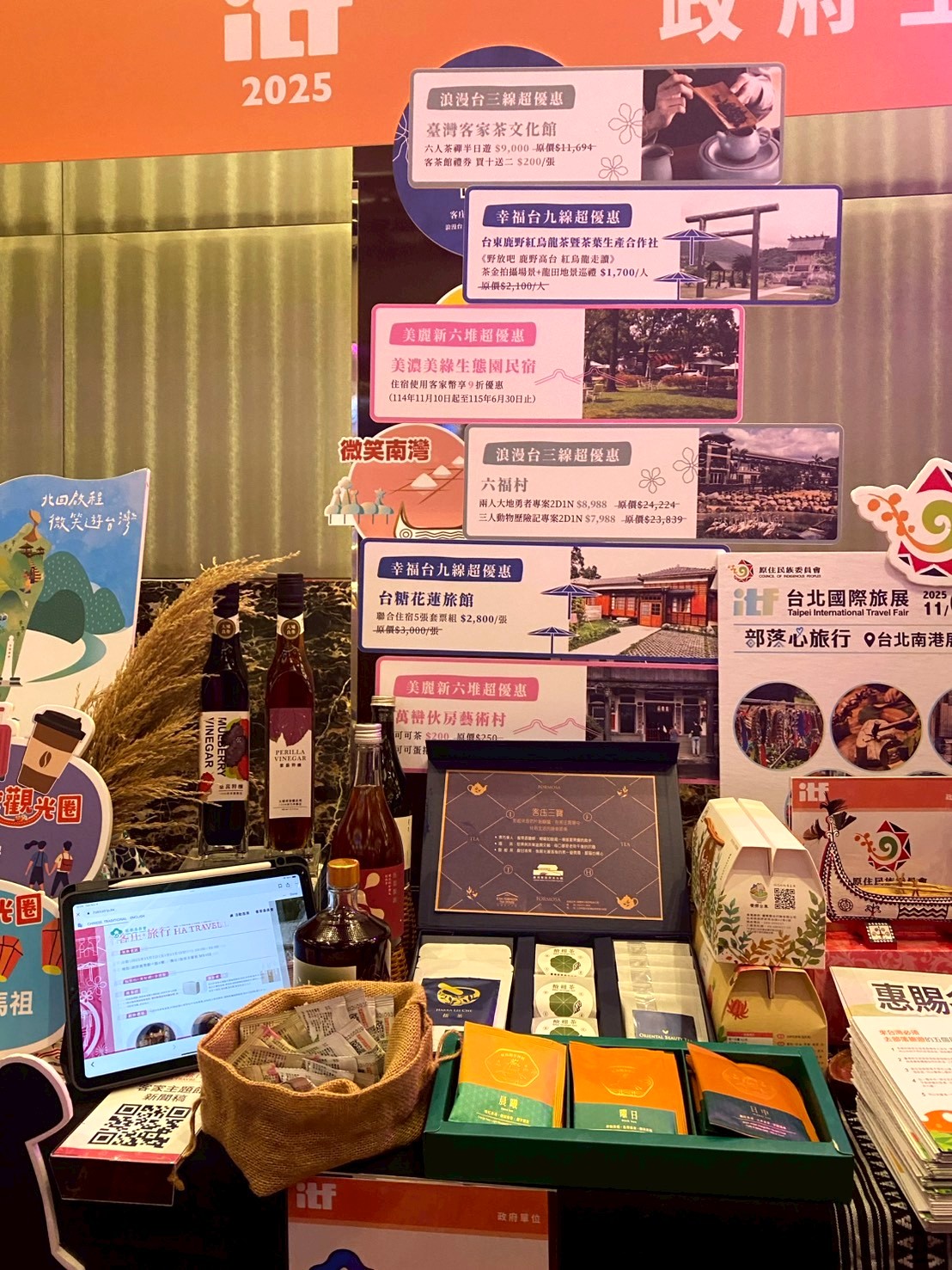 來自浪漫台三線、美麗新六堆與幸福台九線的旅行業者、客庄社區、伴手禮品牌與旅宿業者共34家參展,現場推出百種精選客庄旅遊商品、行程。客委會更攜手可樂旅遊、易遊網、麗緻國際旅行社、締瑪國際旅行社及KKDAY等大型旅行社與旅遊平台,採線上線下聯合展售模式,推出多元客庄主題旅遊產品,包括高鐵假期、綠世界生態農場雙人套票、六福村主題樂園雙人套票、臺灣客家茶文化館「茶禪半日遊」、花蓮糖廠旅宿體驗等豐富行程,帶領旅客深度探索各地客庄魅力。同時,自11月4日起,「客庄。旅行HA TRAVEL」線上旅展活動網頁同步開跑,精選超過150條客庄主題遊程,提供旅客隨時上網選購,線上線下同步開逛,輕鬆規劃客庄小旅行。
