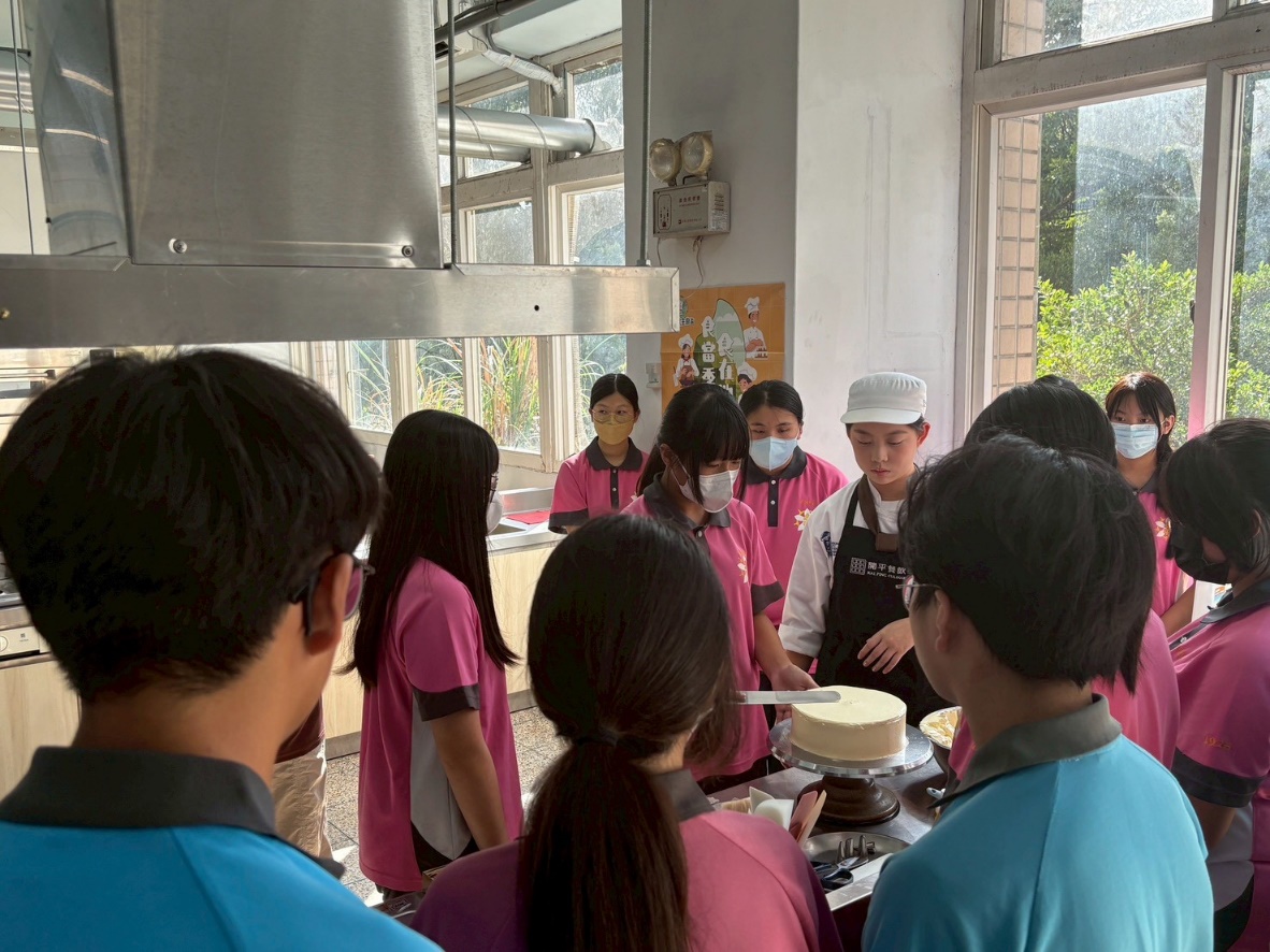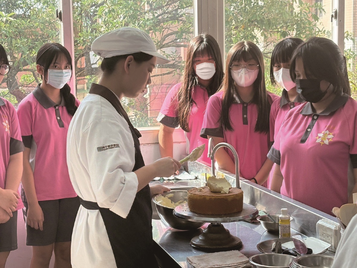 為提升國中生的技術知能,開平餐飲規劃六場入校示範課程,依據競賽類別設計叉燒蝦仁鳳梨炒飯、雞肉奶油蘑菇燉飯及蛋糕裝飾三項主題,邀請現就讀的學生擔任講師,親自示範料理與技巧。課程中,學長姐展現專注細膩的職人風範,從工法技術到工具運用皆細心講解,讓國中學生直觀體驗專業技術的差異。許多學生回饋表示,看到學長姐在講解過程中神情投入、態度自信,讓自己更具備進入技職學習的想像,也發現專業餐飲的細節與深度遠超乎以往。