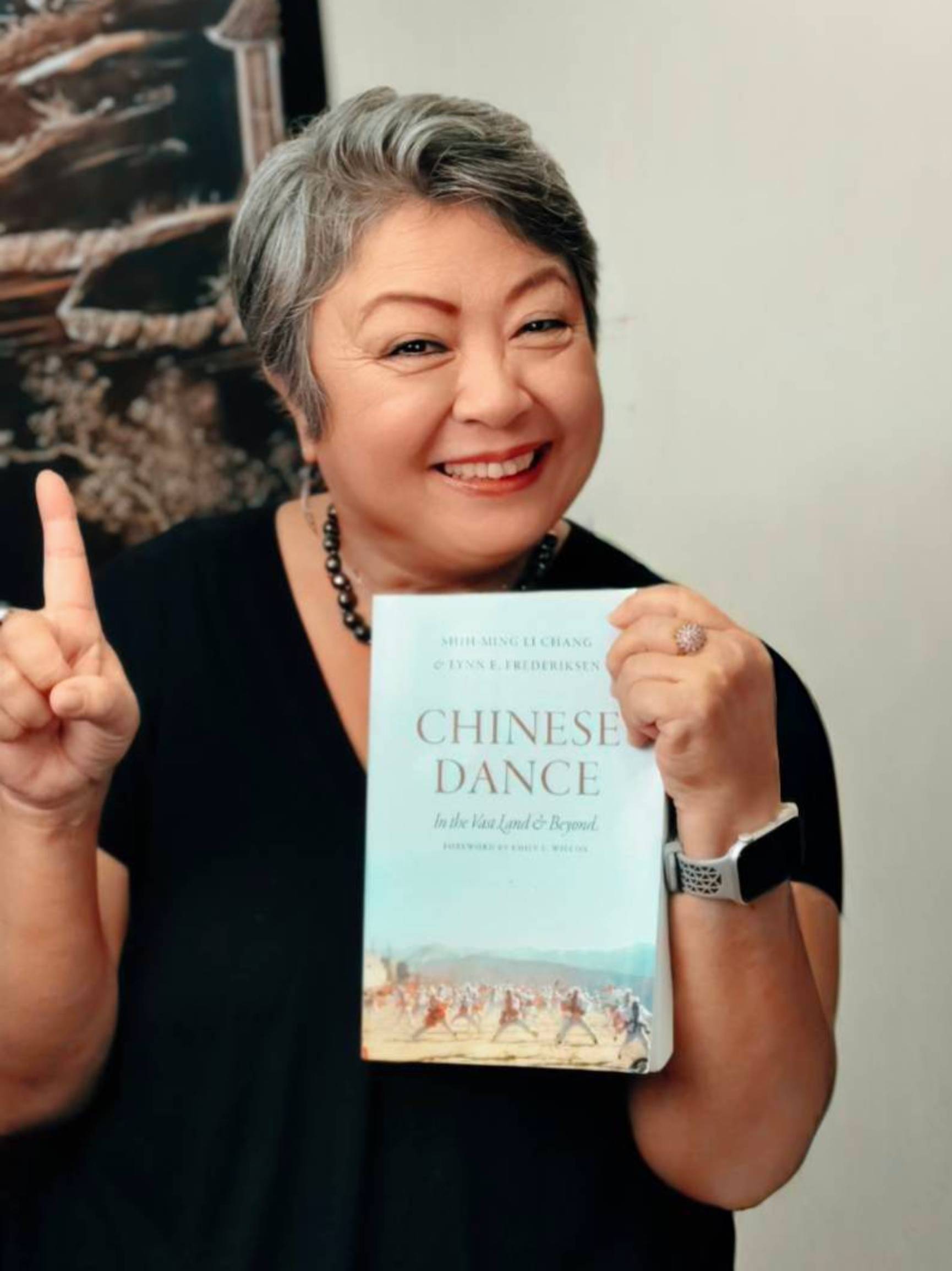 2.李式敏開心展示著作《Chinese Dance: In the Vast Land and Beyond》,這本書以英文介紹中國舞蹈的歷史與文化內涵,收錄超過五百支教學與表演影片,成為跨文化舞蹈教育的重要教材。目前她正著手準備出版中英雙語版,希望讓更多讀者認識中國舞蹈之美。。圖/蘇麗蓉攝影提供