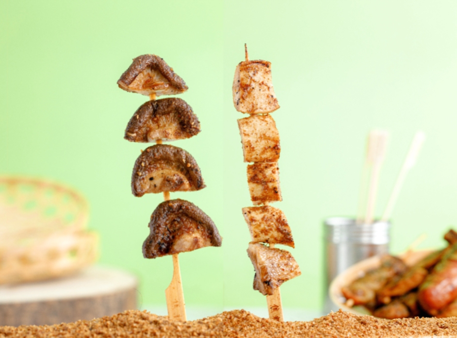 圖說:杏鮑菇串燒烤後外酥內嫩、Q彈多汁,完美吸收焦糖楓獨家的層次香氣。(資料來源:焦糖楓)