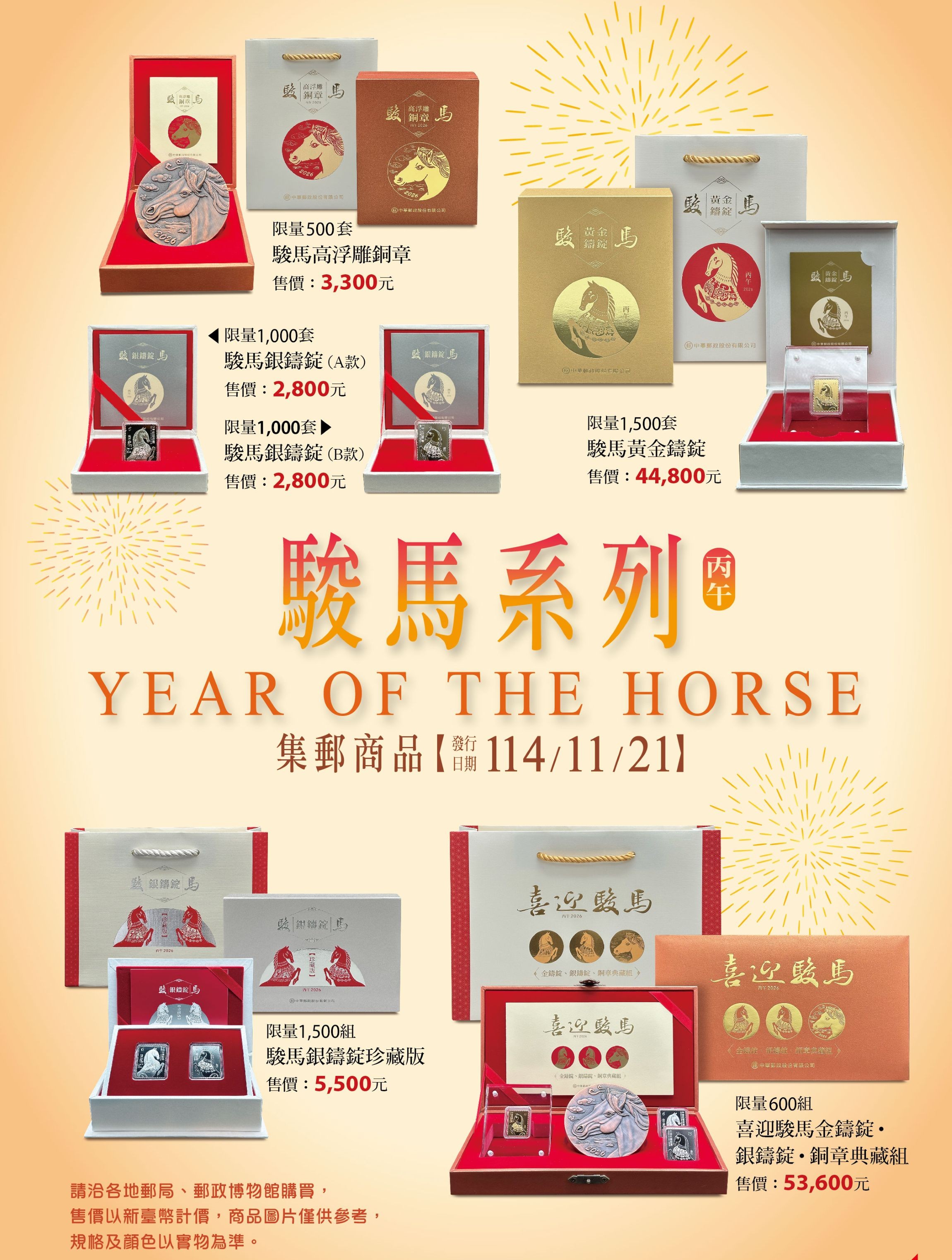 【記者林子霞台北報導】中華郵政公司繼113年發售靈蛇系列集郵商品後,訂於11月21日續推出駿馬黃金鑄錠、銀鑄錠、高浮雕銅章等6款系列商品,委請中央造幣廠承鑄,以細膩的雕刻呈現,輔以典藏包裝盒、專屬提袋及精美說明卡,說明卡由中央造幣廠簽署並加印限量序號,深具紀念意義與珍藏價值,更是餽贈親友最佳獻禮,民眾可至全國各地郵局窗口、郵政博物館洽購。