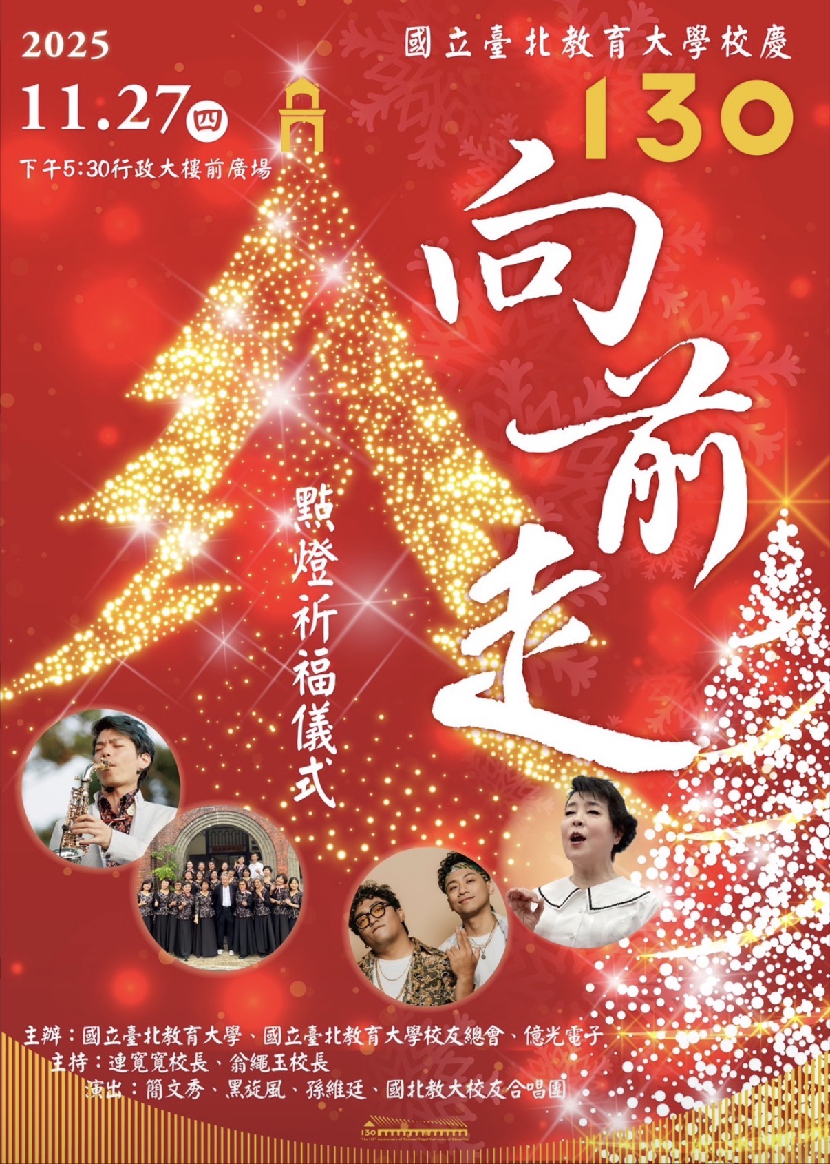 國立臺北教育大學是臺灣最悠久的教育大學,培育無數優秀教師與人才,校友超過二十多萬人,今年歡慶創校 130 週年,與校友總會及億光電子共同舉辦「130 向前走」點燈祈福典禮,將於感恩節當天 11 月 27 日(星期四)下午 5 時 30 分,在行政大樓前廣場(臺北市和平東路二段 134 號)溫馨登場,特別邀請各大宗派領袖蒞臨及點燈祈福!