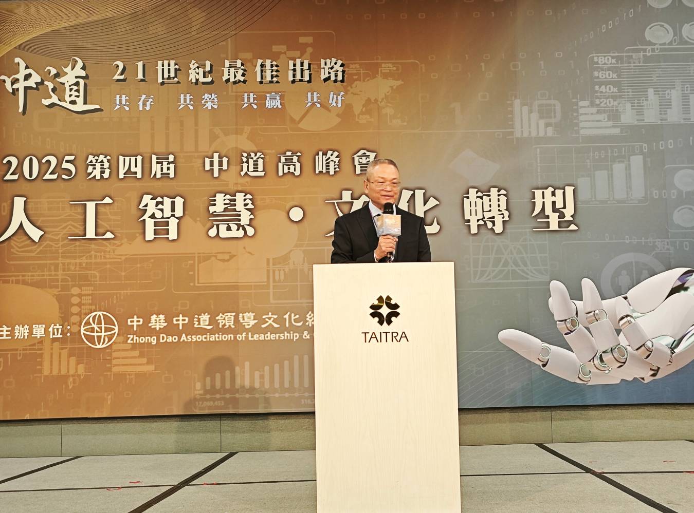 2025第四屆中道高峰會開場由中華中道領導文化總會陳樹理事長致詞,談及 AI 時代的文化挑戰與中道精神的重要性,為大會揭開深具格局的思想序章。