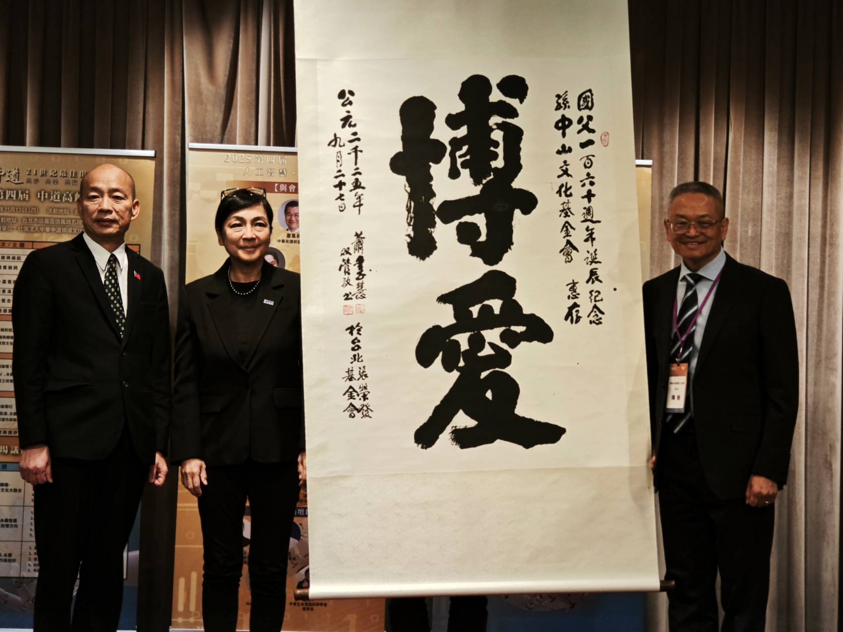 韓國瑜院長於書法作品〈博愛〉前合影留念,在中道精神與先賢理念的象徵下,呼應高峰會對「文化承續與時代新生」的核心價值(左起:立法院院長韓國瑜、國父孫中山後人孫雅麗、中華中道領導文化總會理事長陳樹)。