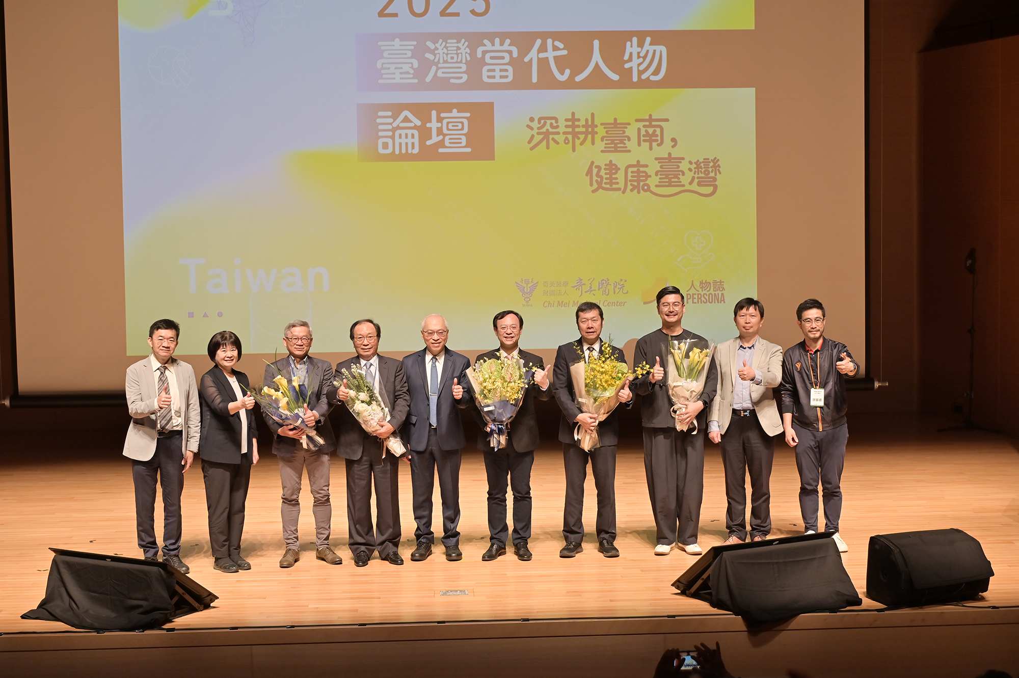 圖說:《2025臺灣當代人物論壇》由人物誌創辦人唐源駿(右三)與總統府國策顧問陳志鴻(左四)、國科會主委吳誠文(左三)、衛福部長石崇良(右五)及奇美醫院院長林宏榮(右四)暢談智慧醫療未來願景,奇美醫院團隊特別上台獻花致意。(資料來源:人物誌)