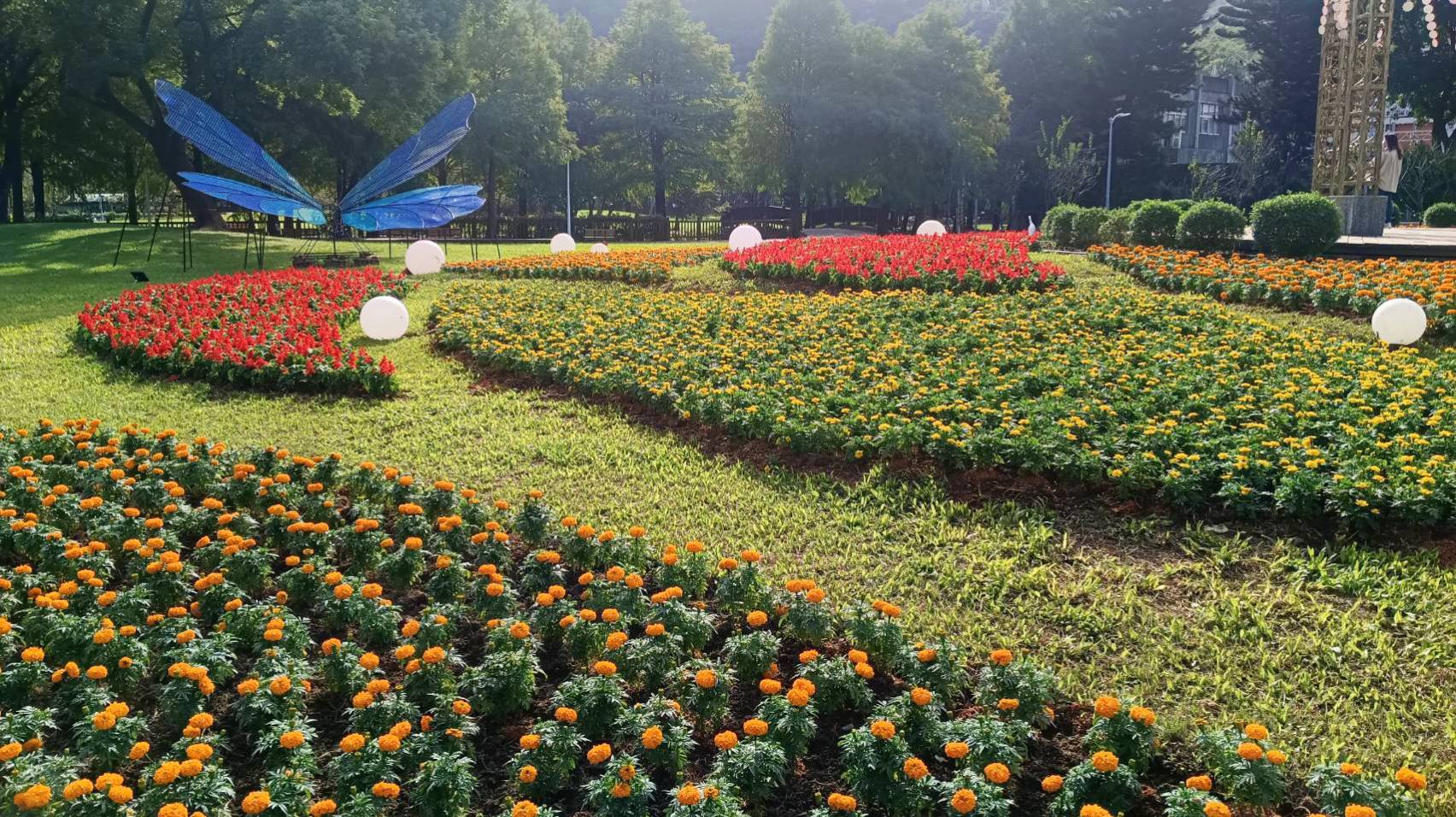 入口處的「藝菊圓夢」展區以熱氣球、飛行器與彩色花卉組成,象徵夢想啟航。「向陽築夢」展區種植「千陽」與「萬陽」品種向日葵,陸續盛開的花朵迎光綻放。「夢花園」展區由觀葉植物與造型菊打造,園藝團隊設計變色龍主角「花傻傻」搭配蝴蝶、狐狸、大象、小鹿等造型,各自象徵不同性格。