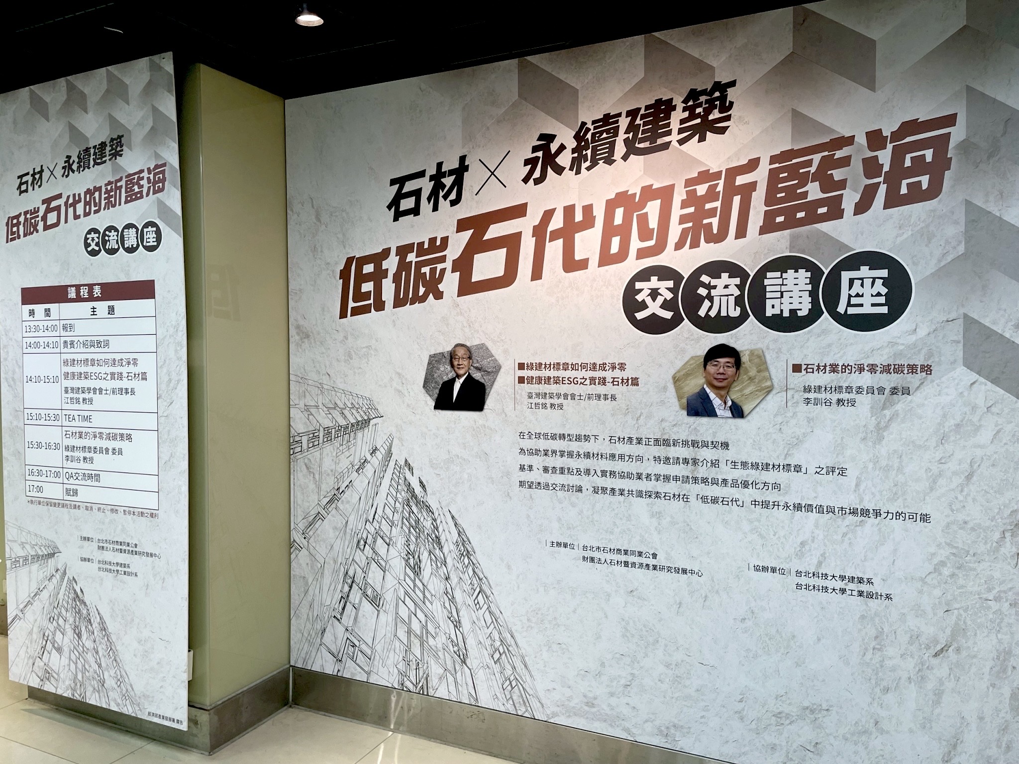 講座特別邀請內政部綠建材標章評定委員江哲銘教授與李訓谷教授擔任講師。兩位專家從制度精神、評定基準到申請細節,深入解析綠建材標章在石材產業的具體應用。