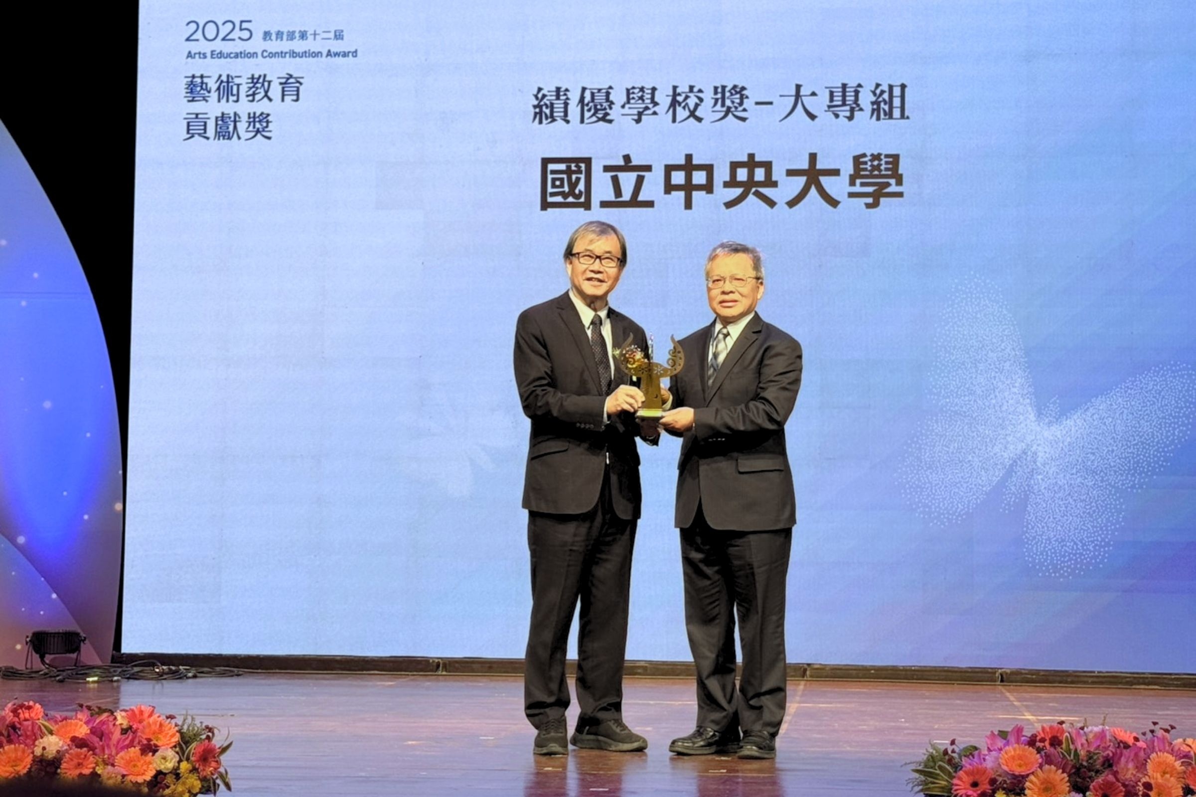 【記者林子霞台北報導】教育部第十二屆「藝術教育貢獻獎」12月16日於南海劇場舉行頒獎典禮。中央大學今年大放異彩,不僅榮獲全國唯一大專院校的「績優學校獎」,中大崑曲博物館館長洪惟助教授更獲頒「終身成就獎」。雙重肯定彰顯中央大學長年深耕藝術教育、推動文化扎根與保存的重要成果。
