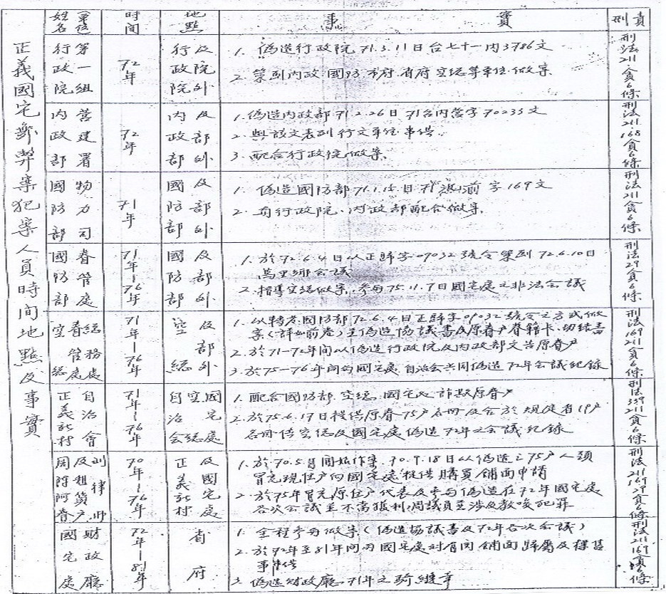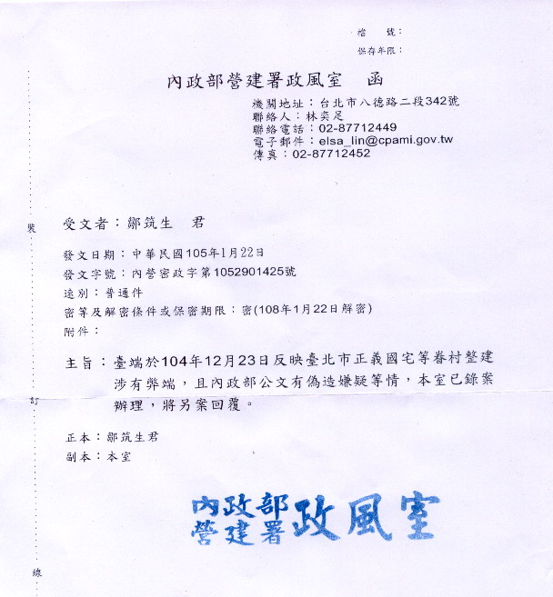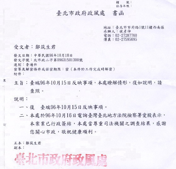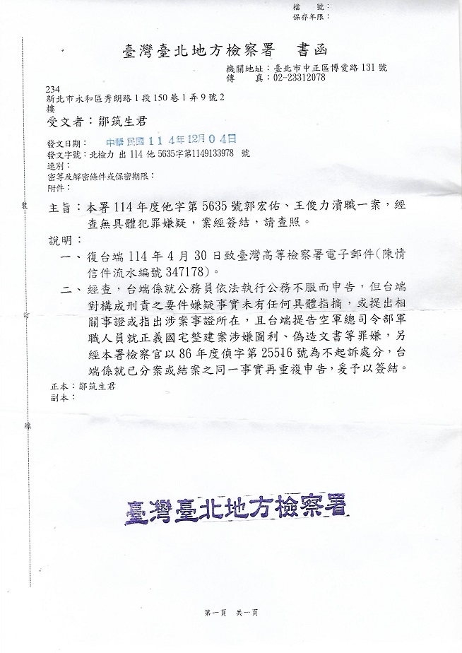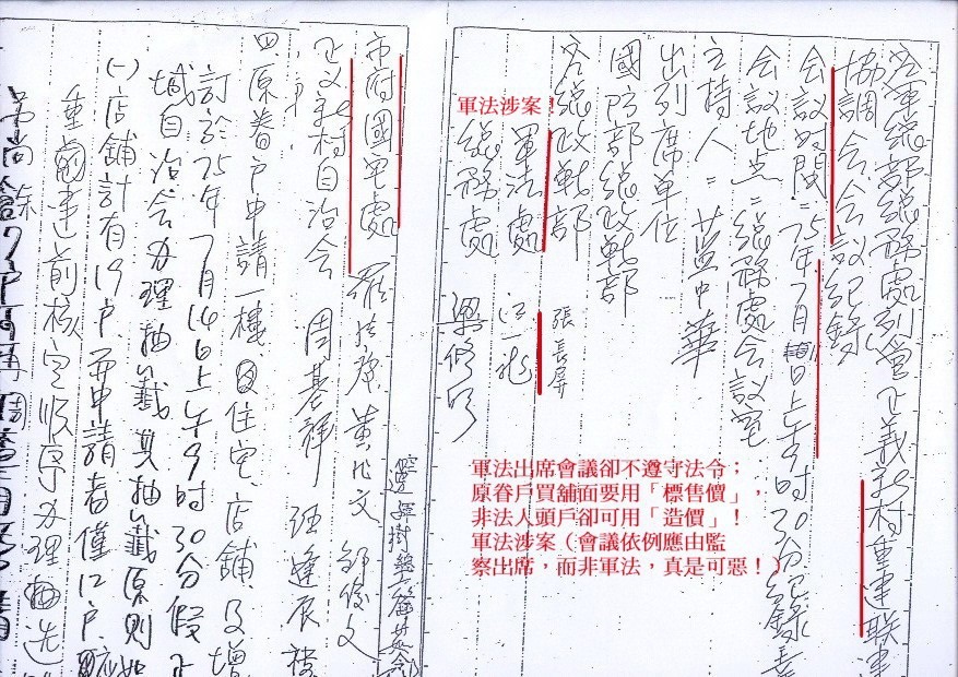 請議會(議員)協助事項: 陳情人鄒筑生於115、01、16日0900時,與政風承辦人蔡小姐通話協調結果如下:(聯絡電話:02-27208889轉7754) 1、軍方原眷戶及市府被盜賣的台北市忠孝東路三段改建後的正義國宅(忠勇新城)96戶精華舖面(市府48戶,市值50億元),市府將不再追討,也不協助我法律輔導訴訟,也不協助我調卷訴訟,幫市府打贏官司: 2、請向市府調卷:(此三卷市府均有) (1)、行政院71、03、11日台(71)內字3786號文 (2)、內政部71、02、16日71台內營字第70233號文 (3)、台北地檢署77年度偵字14417及78年度664號不起訴處份書 (該處份書郭宏佑檢察官並未開庭,告訴人蕭明華也不知情,她為檢、調勾結共用的人頭,卷中蕭員欠缺身份字號,年齡、職業也錯誤,為偽造文書) 3、眷村改建舞弊非正義國宅一處,全省800著眷村改建都有弊端,那麼多高級將領分到店面,及偽造舖面為省府所有,要公開標售錢歸省府...最後卻被「市議員周陳阿春」一通電話後,被市府國宅處及軍方(空總、國防部)人員通通以告「造價」賣出給軍、政要員及含冒充合法原眷戶人員,事