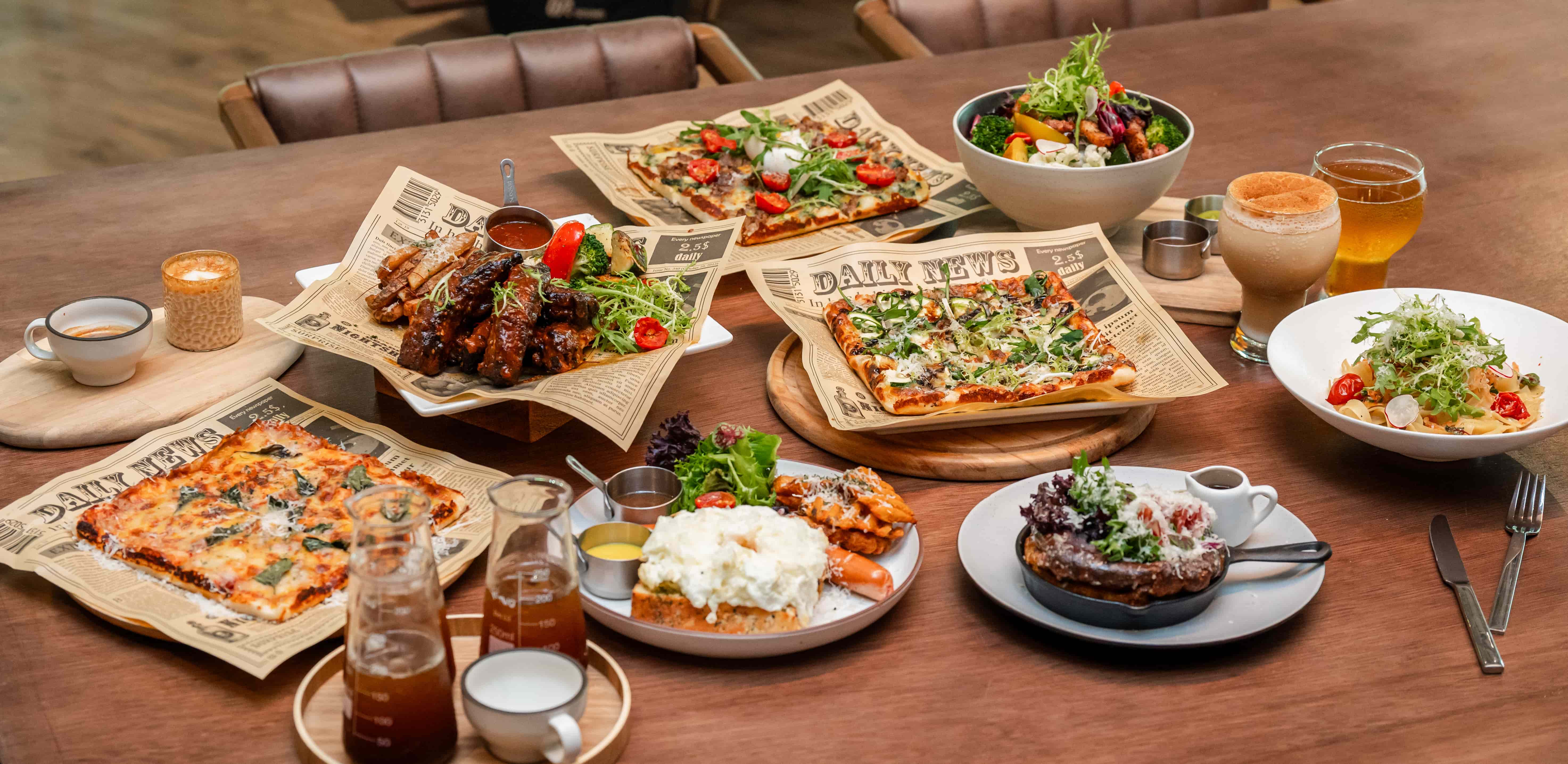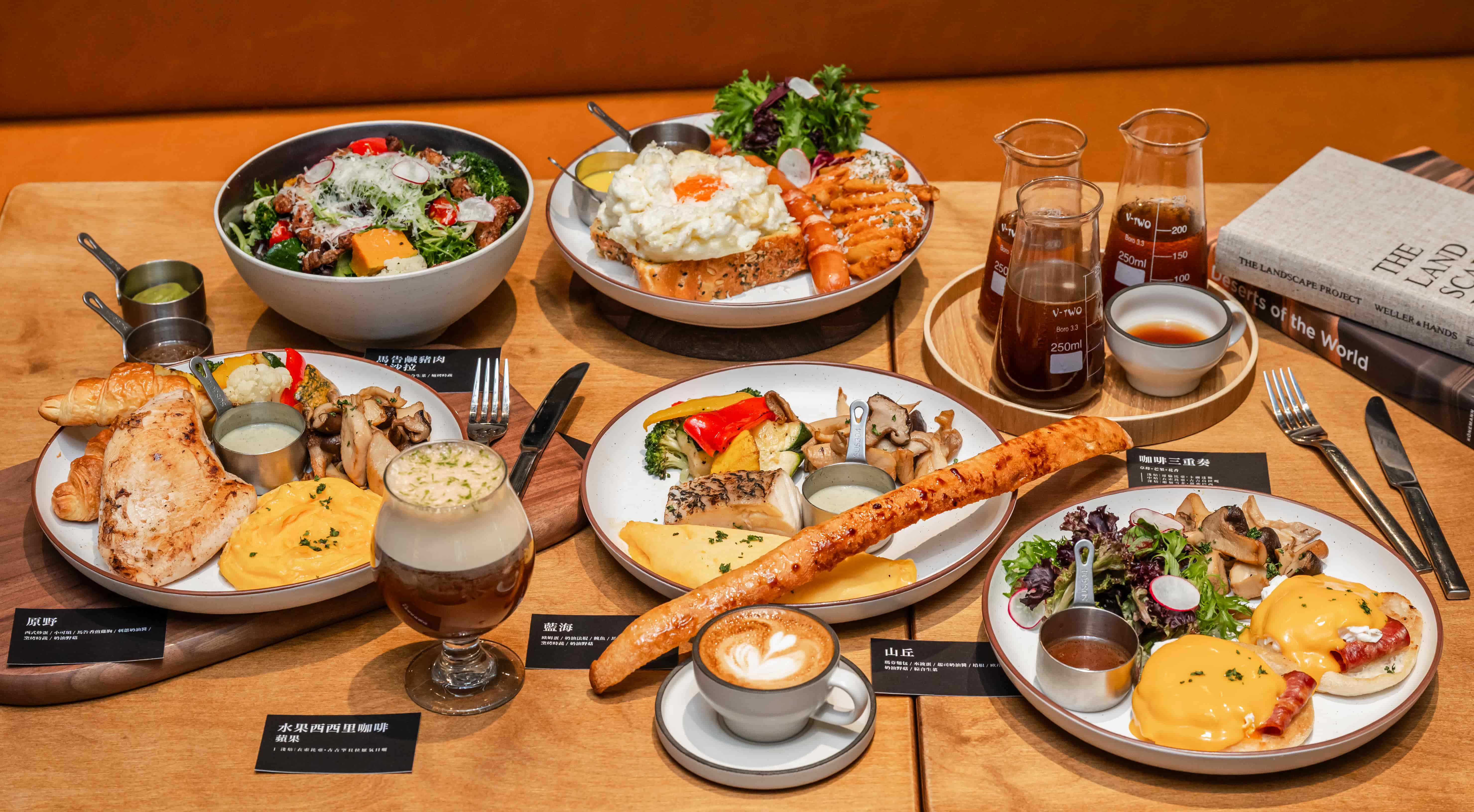咖啡飲品主打「美式三重奏」,一次可品飲淺、中、深焙三種焙度,感受不同產區層次與風格;水果西西里咖啡選用獨特淺焙咖啡豆,融合新鮮水果的清爽酸香,白霧水果茶則以當季鮮果搭配嚴選茶品,口感純淨自然。餐食部分,清晨推薦慢燻厚火腿堡,早午餐以「原野」與「藍海」展現豐富而均衡的搭配,正餐則有人氣海鮮燉飯、牛五花義大利麵與經典豬肋排等,滿足不同時段用餐需求。現場烘焙的是對腸胃友善的魯邦種麵包,風味扎實、香氣溫潤,成為不可錯過的亮點。