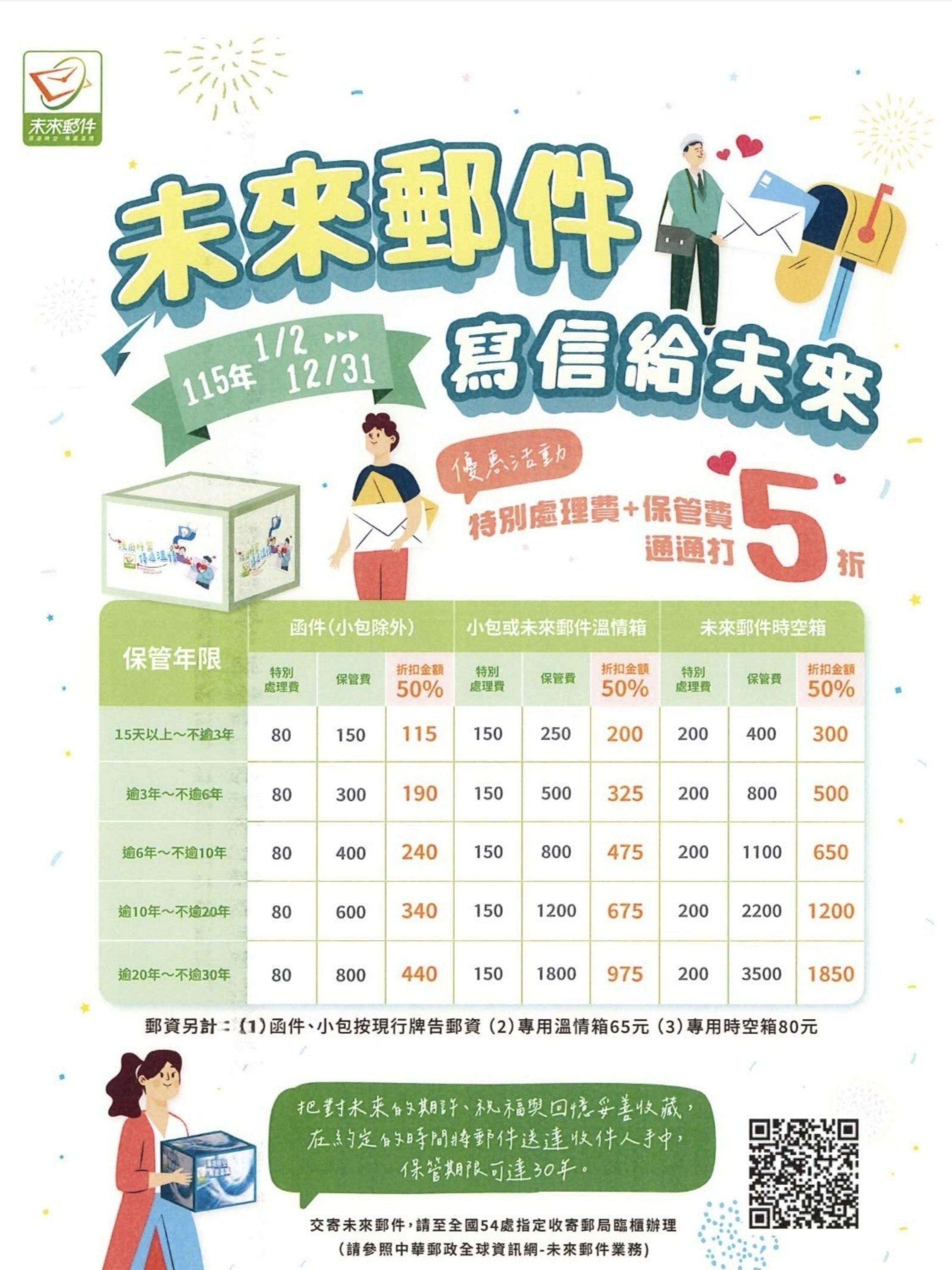 中華郵政公司自114年10月3日起啟用全新Slogan「漫遊時空 傳遞溫情」,並同步推出「未來郵件溫情箱」及「未來郵件時空箱」兩款專用紙箱,象徵珍藏郵件、寄託心意的獨特使命。另為提升服務品質,已同步簡化保管年限計費標準,並調整特別處理費及保管費,提供民眾更便利、貼心的用郵體驗。民眾可至全國54處指定收寄郵局寄件,相關收寄郵局資訊可至中華郵政全球資訊網「郵務業務專區-未來郵件業務」查詢。