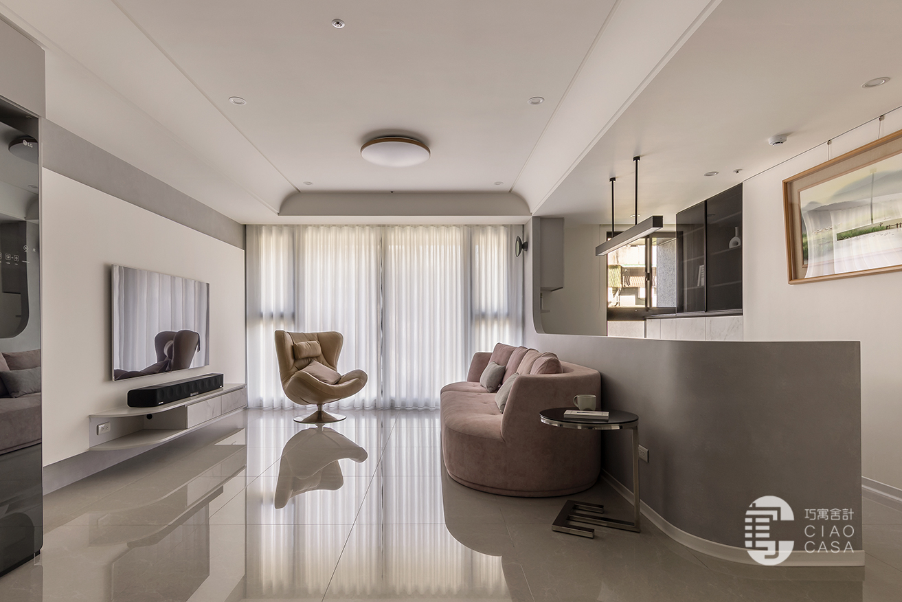 3.立體雕塑感電視牆如書頁翻篇,巧寓舍計以幾何與光影鋪陳,定調空間的深度與層次。