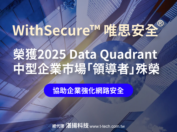 WithSecure™唯思安全®台灣總代理湛揚科技提供WithSecure Elements整合式模組化雲端資安解決方案,涵蓋本次獲獎的端點防護(EPP)、端點偵測與回應(EDR)和曝險管理(XM)等專業技術,協助合作夥伴建置可延展、易管理,且具前瞻性的資安架構,從容「超前部屬」快速演進的網路威脅。湛揚科技同步推出「EPP+EDR升級套餐」獨家優惠,並提供最新雲端安全產品的試用申請服務,協助企業快速、便利地導入進階資安防護。更多資訊歡迎造訪湛揚科技官網https://www.t-tech.com.tw或洽詢服務專線02-2515-1585,湛揚資安團隊將提供完善的資安建議與導入規劃。