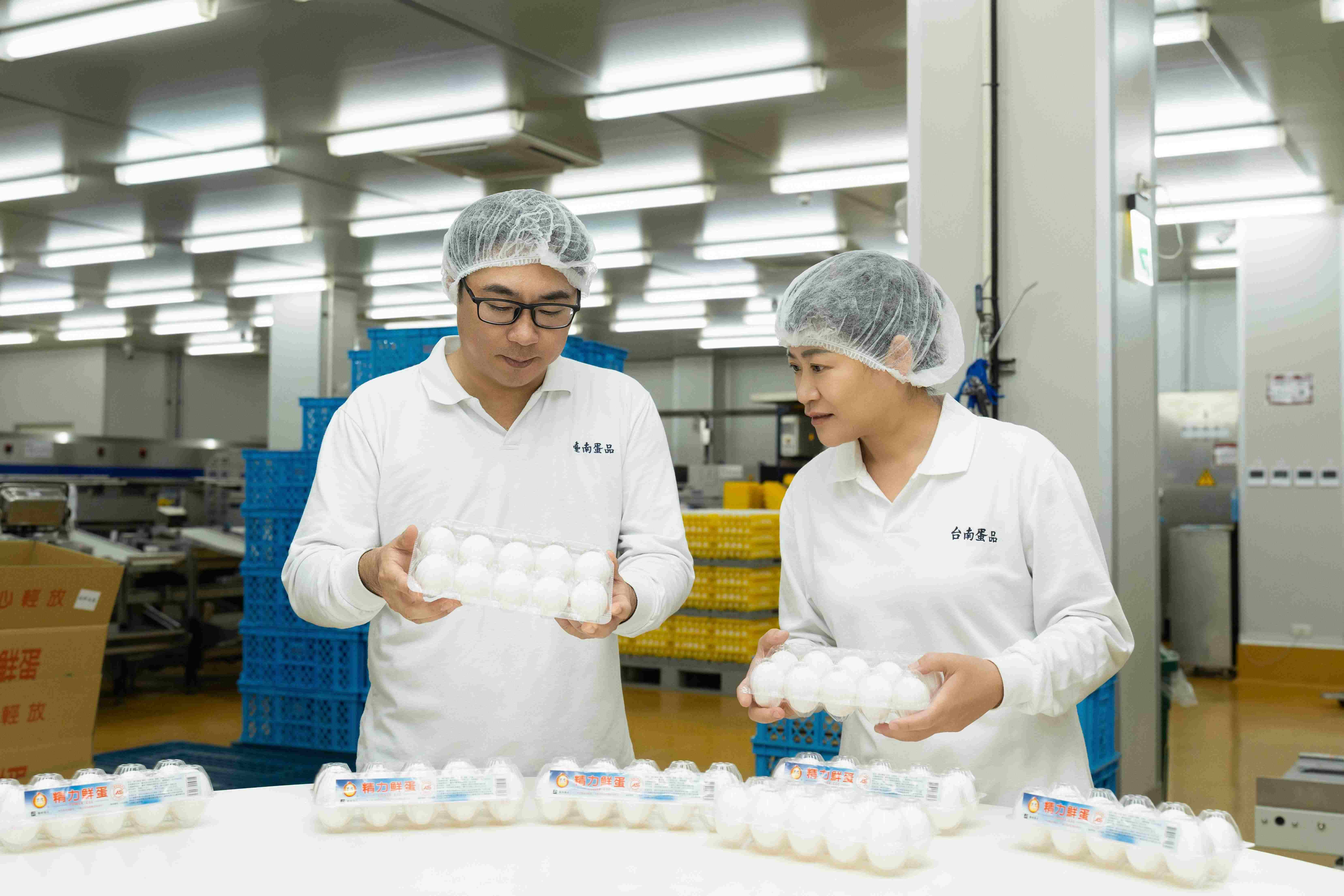 圖說:臺南蛋品總經理陳昭延(左)與品管課長戴月娥(右)於洗選線上嚴密抽檢,從源頭到成品層層審核,實踐對消費者餐桌安全的健康承諾。(資料來源:臺南蛋品)