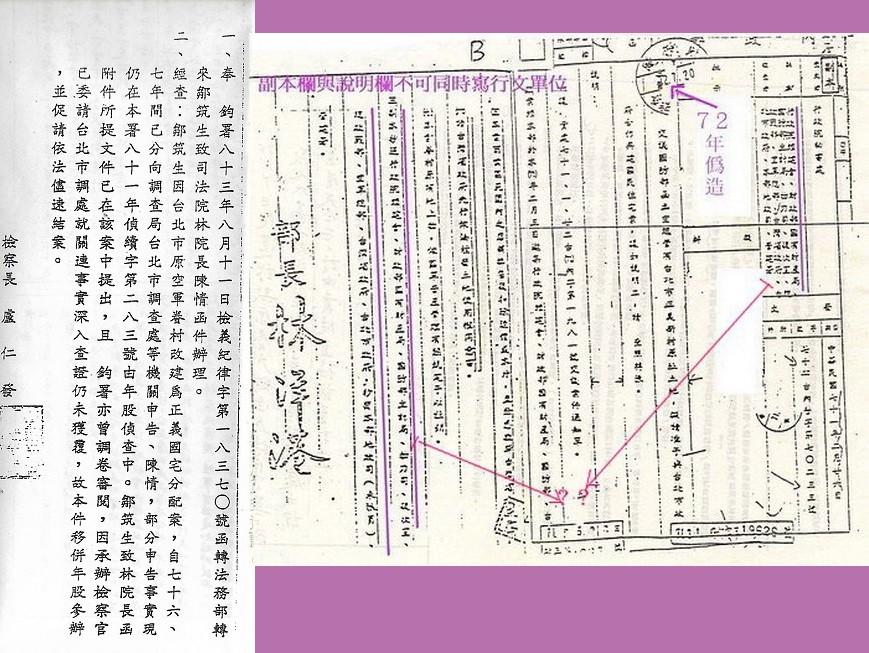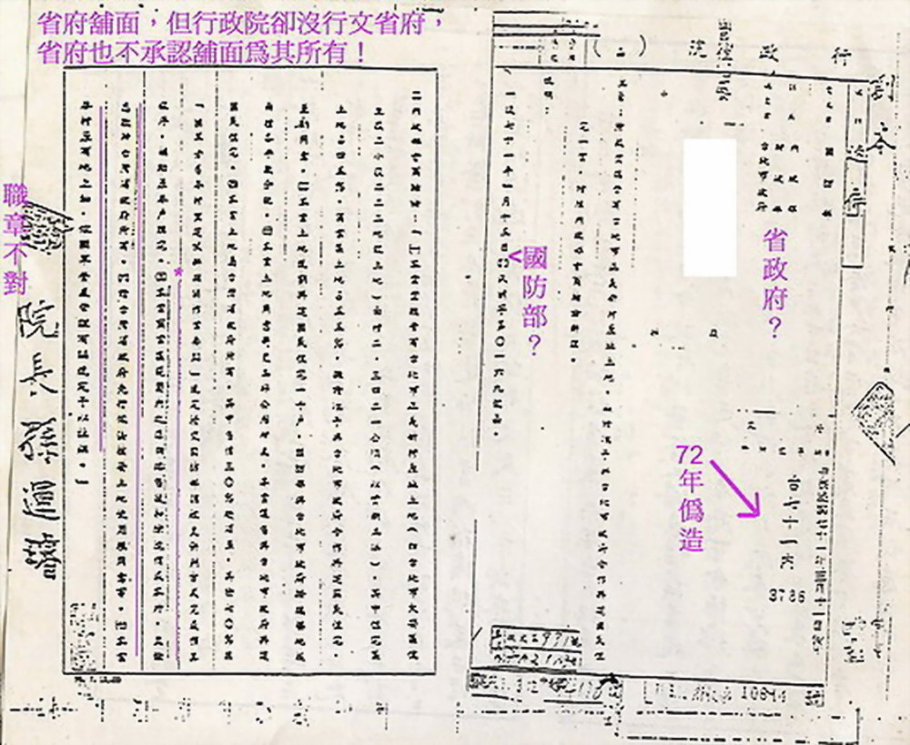 內政部涉案部份: 1.上行文(行政院)應用全銜(內政部長 林00)。 2.副本過多應列說明欄(不可同列)。 3.內政部僅負責土地變更及容積率核定(無權分店面)」。 (店面是由軍方及市府所簽各案協議書決定,且省府也不承認店面是他的。 為何市議員「周陳阿春」僅憑一個電話,就把省府店面賣了,你不覺得奇怪嗎? (已准 指示辦理)。中間空 格,是奉那位大官指示? 4.內政部不可對國防部眾多二級單位直接行文。 5.內政部公文,發文日期是71年,但卻是在72年所偽造。(懷疑該次會議未召開) 6、內政部政風單位迄今仍在包庇營建署、國防部、空總等涉案人員。 (廿年前內政部政風女承辦人,都會把我電話轉接另一男性回應,但聼其對內情的瞭解,應為營建署涉案人員,但他卻自稱為「政風人員」,且極不耐煩的回答我:國防部會回我的文...) 7.省府在70年即發出「土地使用同意書」,內政部72年偽造文還在鬼址!(未發) 但國防部也是涉案單位,所以迄今未回文(那內政部公文倒底是誰偽造的?)