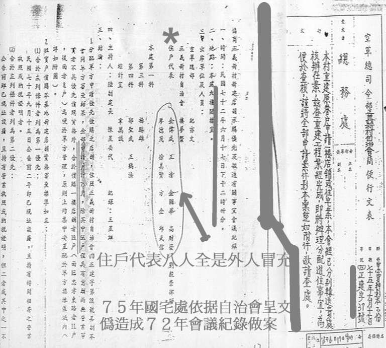 本案涉案人計: (1)、75年所偽造之72、05、25日會議參加人員:市議員:周陳阿春國宅處:何欽铃、楊勝雄、陳星岳、王鶴法、羅法度、張昭華、邱淑中、韋萬誠、王星濰、(處長未簽名)。 承租戶代表:廖德茂、徐美賢、徐楚材、方全、王清、陳勤英、金偉成、金國華、邱武信、劉穀榮律師 (2)、75年所偽造之72、06、17日舖面分配會議參加人員:空軍總部:紀亦文正義新村自治會長:樓夢鰲住戶代表(全係外人冒充):金偉成、金國華、王清、方全、邱武信、廖德茂、徐美賢、高財發、劉穀榮律師國宅處:楊勝雄、郭聖武、王鶴法、韋萬成、王星濰、陳星岳 10、在75年在空總以偽造之72年舖面分配會議參加分贓人員:空總:藍中華(總務處處長)、江一龍(軍法官)、梁修明、張長屏國宅處:羅法度、鄒俊文、黃飛文 自治會:周基祥、汪逢辰 11、72年涉案之行政院第二組人員,內政部營建署人員、省政府財政廳人員,因須調原文底稿,才能確定人員名字(此部份可請政風或調查局人員查核。) 12、各涉案單位核心人員均為以往軍方任職再轉任,故彼此均為故舊,才能結夥做案。 13、本案核心人員:(均包括其上級直屬長官)