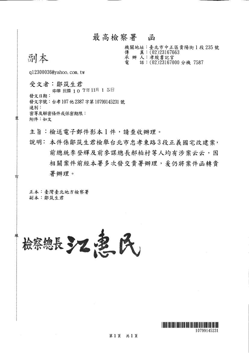 檢察長信箱 您好: 1. 有關告發前台北市長黃大洲部分,臺端陳述內容,本署已收案辦理。 2. 有關臺端來信告發台北市正義國宅舞弊等一事,因所述未臻具體, 如欲提出告發,惠請敘明申告對象及犯罪事實,並檢附相關不法事證, 向有管轄權之地方檢察署或警察局為之。謝謝。 臺灣臺北地方檢察署 敬啟 ............................................. 敬啟者: 本人已依台北地檢署指示,於六月向新北市刑大及永和分局報案並製作筆錄,但因案情重大:全省800餘眷村改建... (涉及軍、政要員,及國軍中負責肅貪防弊的軍法、政戰人員,調查局等人執法犯法,故需行政院、國防部、內政部、市府、調查局等政風人員、警方人員齋力偵辦為要)。 市刑大黃瑞泰警官,永和分局周德和警官。 呈 廉政署 告訴人:鄒筑生上 1028