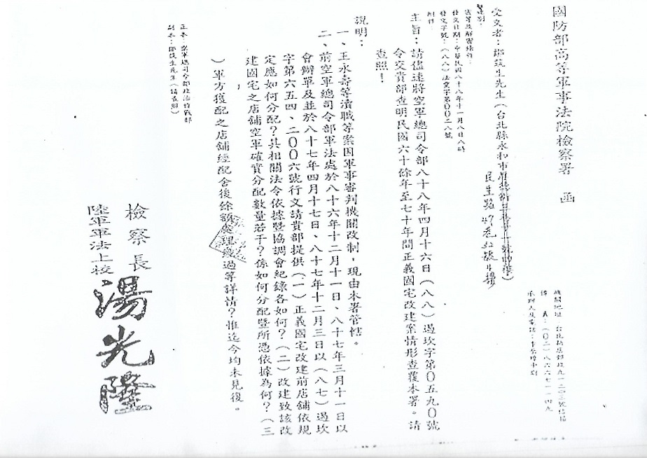 請重啟調查李登輝、郝柏村兩人所涉舞弊案! 國軍兩大舞弊集團(軍購、眷改)各貪污數佰億元,但因軍、政要員涉案,且在軍中負責肅貪、防弊的政戰、軍法人員也牽連其間,而調查局、地檢署也相繼便宜行事,配合吃案。 1、調查局在77年二月接獲台北市政風處通報,台北市忠孝東路三段正義國宅(忠勇新城)改建案有重大弊端,迅即與國防部反情報總隊成立專案,並由最初檢舉本案的原眷戶(鄒筑生、宋昭餘),及國宅處人二原承辦人賴來忠先生共同在五月時至台北市調處專案小組說明,並與涉案人員對質,因為眾多非原眷戶非法購得舖面,故案情迅速明暸,但市調處將全案呈報局本部後隨即石沉大海,專案小組也解散。 吾等不甘被吃案,在78年初再向台北市議會陳情,由於舖面一半為市府所有,故由市議會決議,成立專案小組展開調查,是誰盜賣?及偽造文書,調查期間禁止舖面權狀轉移登記。 2、沒想到同時間又爆發「榮星案」,該案係「僑福建設」副董事長鄒纾予(原台北市調處處長轉任)協同調查局偵辦,調查局局長兒子(翁祖焯)竟在市調處能跨科指揮,且調查局每日發佈新聞稿炒熱氣氛,局長與地檢首席檢察官劉景義也利用假日攜手去看守所探望「正義案」白手套市議員周陳