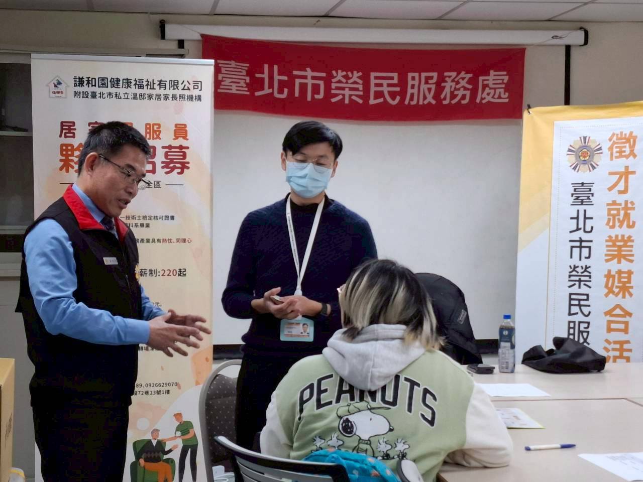 為響應政府長照3.0政策,實現「健康老化、在地安老、安寧善終」願景並填補長照人力缺口,臺北市榮民服務處(21)日邀請溫邸家居家長照機構辦理「單一徵才媒合活動」,媒合照服員及居家服務督導員職缺,洽詢及參與榮民眷互動熱絡。