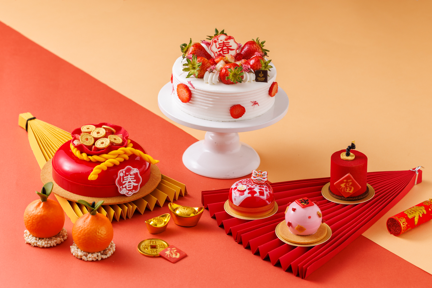 同系列還有以喜慶鞭炮為造型的「咖啡洋梨」,將洋梨的清甜、馬斯卡邦的柔滑與咖啡慕斯的深韻巧妙融合;以及外型討喜、寓意大吉大利的「旺來橘祥」,以鳳梨慕斯搭配橘瓣與橘子醬,明亮果香在舌尖綻放,為新的一年討個好彩頭。