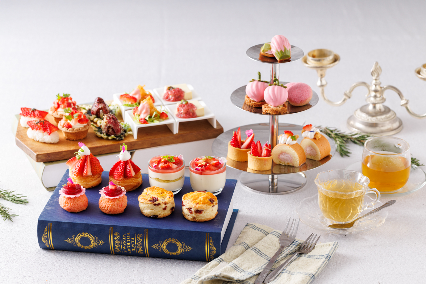 圖說:JR東日本大飯店台北的草莓季雙人下午茶,集結共14款鹹甜點心,售價1,480元+10%。(JR東日本大飯店台北提供)