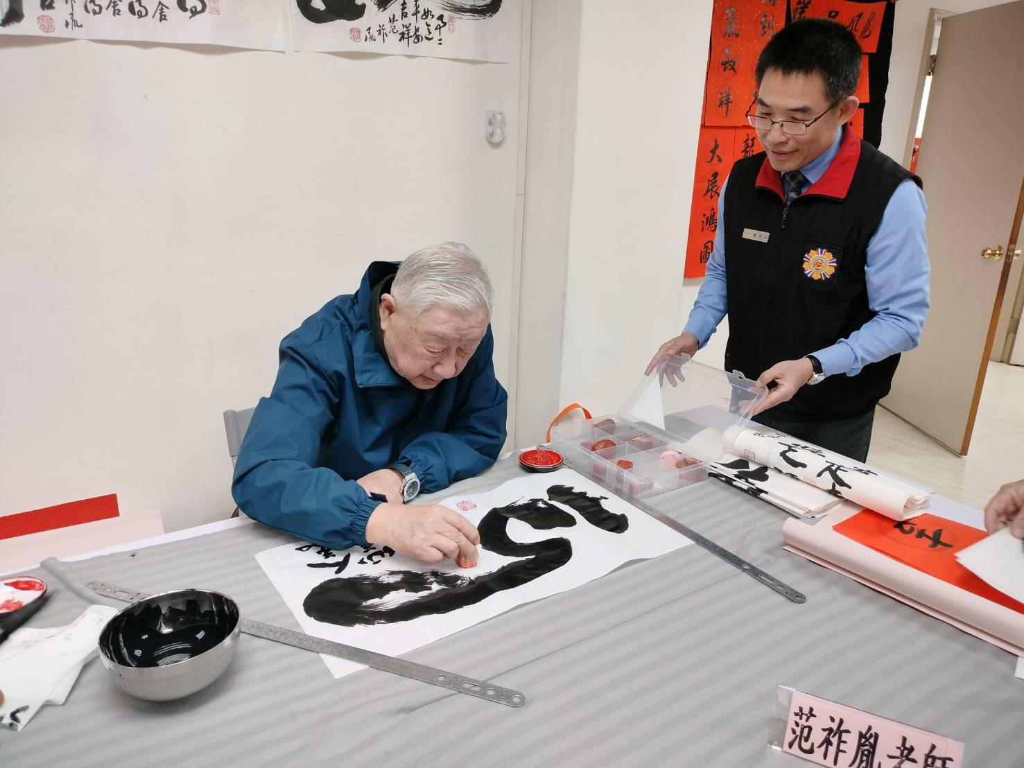 本次受邀揮毫的書法老師,包括榮民范祚胤將軍、淡水八里書畫會郭香玲會長、簡孟樹副會長、高素喜副會長,以及榮欣志工江茂村老師等5位,分別以楷、行、草、隸、篆等不同書體現場揮毫,展現精湛書藝,吸引洽公榮民眷及現場來賓駐足欣賞,一同感受筆墨間的年節喜氣。