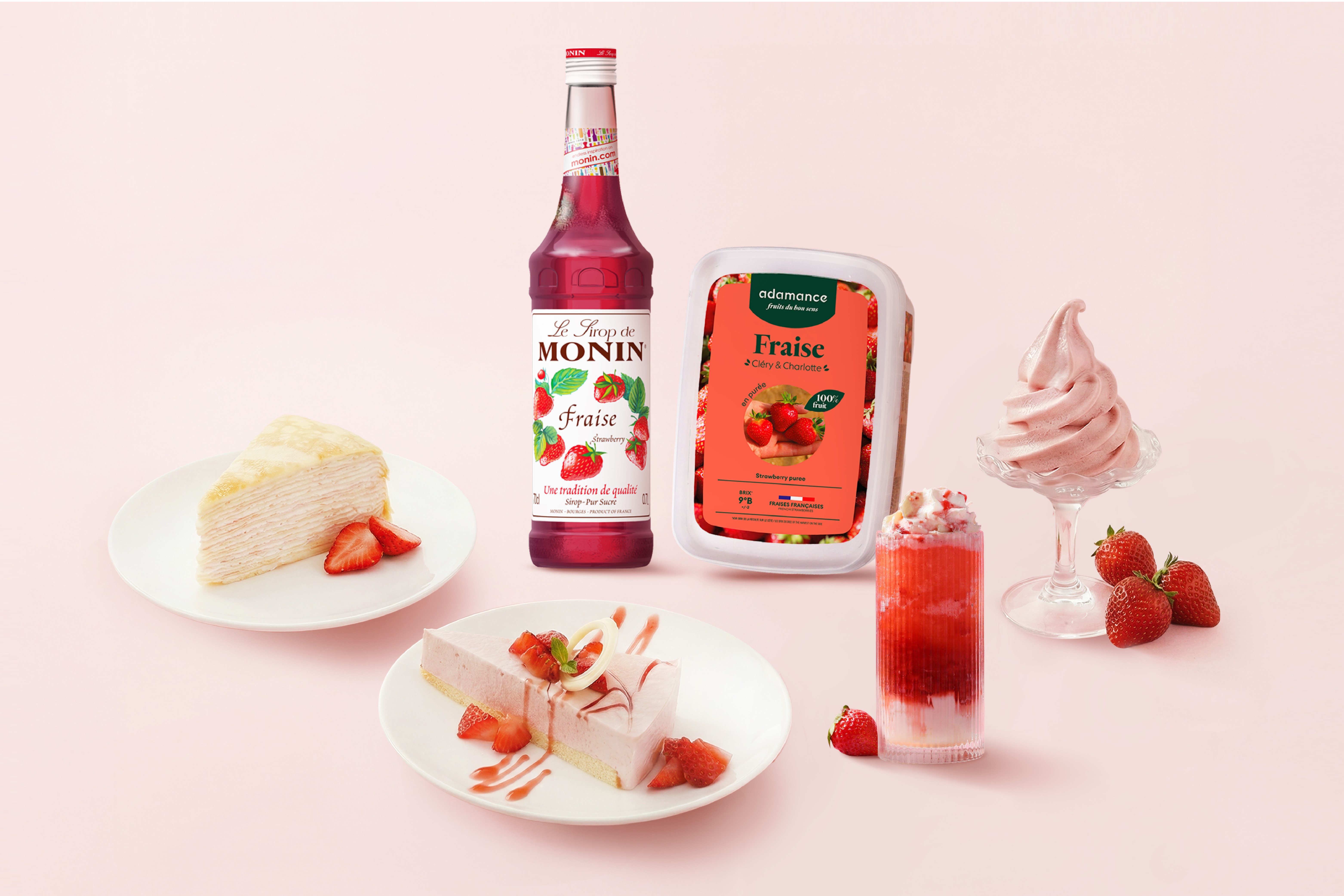 在烘焙與甜點領域,開元引進來自法國的Adamance艾達曼冷凍果泥,嚴選法國卡龐特拉地區克萊麗與夏洛特品種草莓,結合當地風土與氣候條件,呈現飽滿、酸甜的風味,強調無額外添加糖,呈現水果原始風味,為甜點師開啟自由創作的空間,能廣泛應用於蛋糕內餡、慕斯與甜點製作,深受專業烘焙師與甜點主廚青睞。