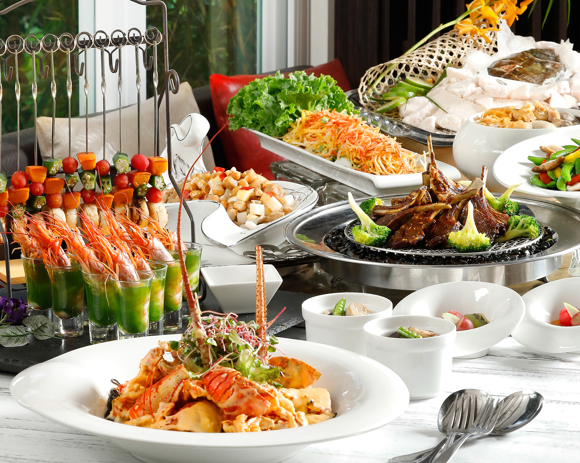 《龍王蟹后春宴》菜色包含「龍王蟹后干貝沙拉」、「鮑魚北菇佛跳牆」、「龍蝦白雪鍋」等海味主軸料理,結合龍蝦、鮑魚、干貝等年節象徵食材,呈現團圓與豐盛意涵。整套宴席共11道料理,平均每人消費約2,000元內,鎖定家庭聚餐與企業春酒市場。