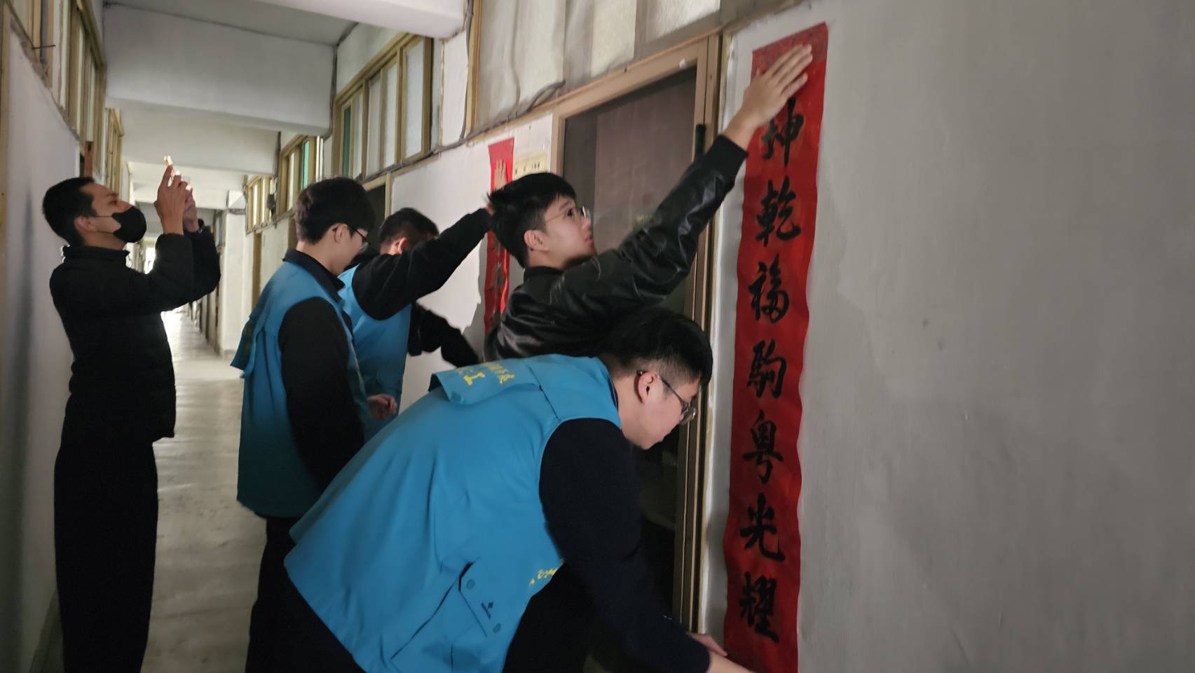 清晨的吳興街國軍單身退員宿舍,在志工的到來下顯得格外熱鬧。志工隊長沈麗華帶領學生榮欣志工們,熟練地為長輩清理環境。最特別的是,黃信仁處長就三位退舍伯伯的姓名與籍貫精心提詞,並邀請書法老師揮毫,創作出獨一無二的專屬春聯。當紅紙黑字寫下長輩熟悉的名字與故土記憶,原本斑駁的牆面瞬間亮了起來,伯伯們激動地撫摸紅聯,眼裡盡是感動。