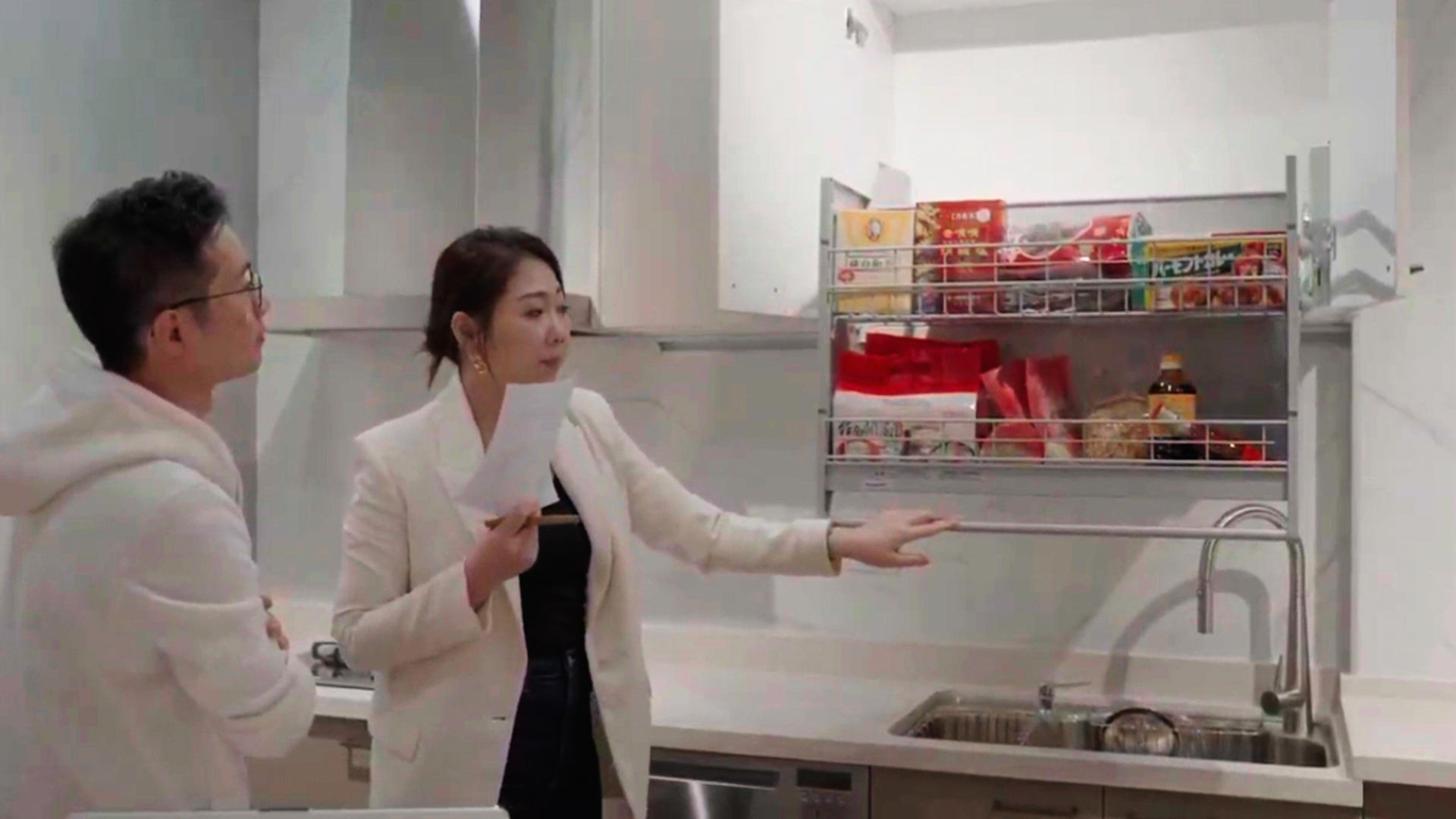 設計總監吳孟娟與屋主兒子說明安裝可下拉式置物櫃 (圖/業者提供)