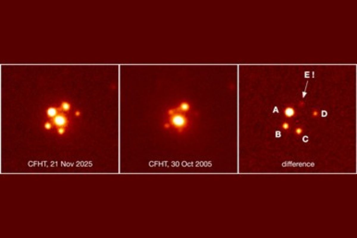 圖說:加法夏望遠鏡(CFHT)/MegaCam於2025年11月21日拍攝的影像揭示SN 2025wny(SN Winny)「可能的第五個透鏡影像」,以字母E標示。(艾立安、陳婷琬、Stefan Taubenberger提供)