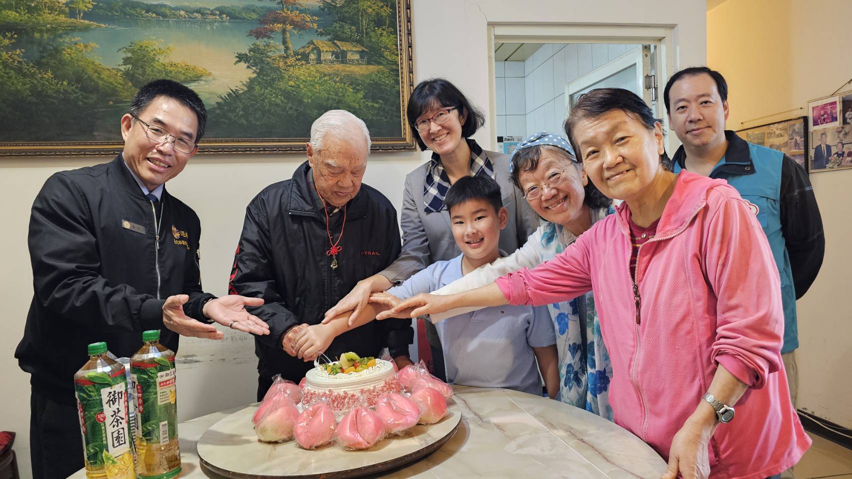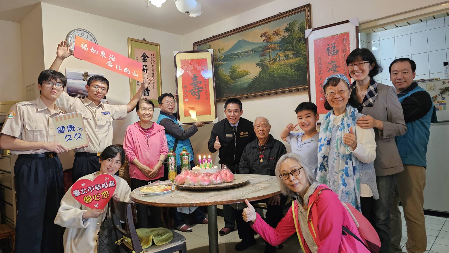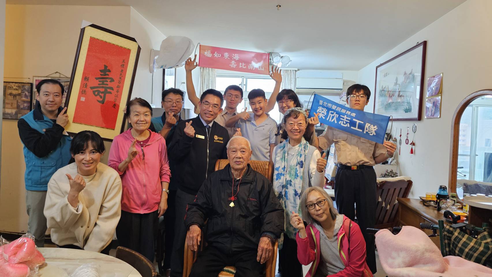 為祝賀文山區彭爺爺迎來百歲壽辰,臺北市榮民服務處處長黃信仁(26)日率領輔導員、社區服務組長、榮欣志工前往府上祝壽。黃處長轉達總統及行政院長祝壽壽屏,並代表國軍退除役官兵輔導委員會主任委員嚴德發致贈壽桃造型紀念金飾,表達最誠摯的祝福。現場在榮欣志工及家人的溫馨陪伴下,眾人齊唱〈生日快樂歌〉與〈黃埔祝壽歌〉,歌聲中洋溢著溫暖與喜悅,共同為彭爺爺慶賀這寶貴的百歲時刻。